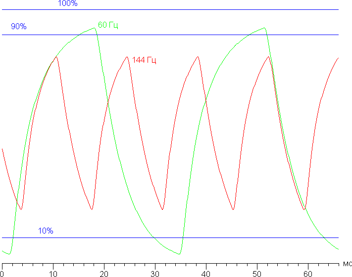 Также приведем зависимость яркости от времени при чередовании белого и черного кадра при 144 Гц кадровой частоты (и для сравнения при 60 Гц кадровой частоты):