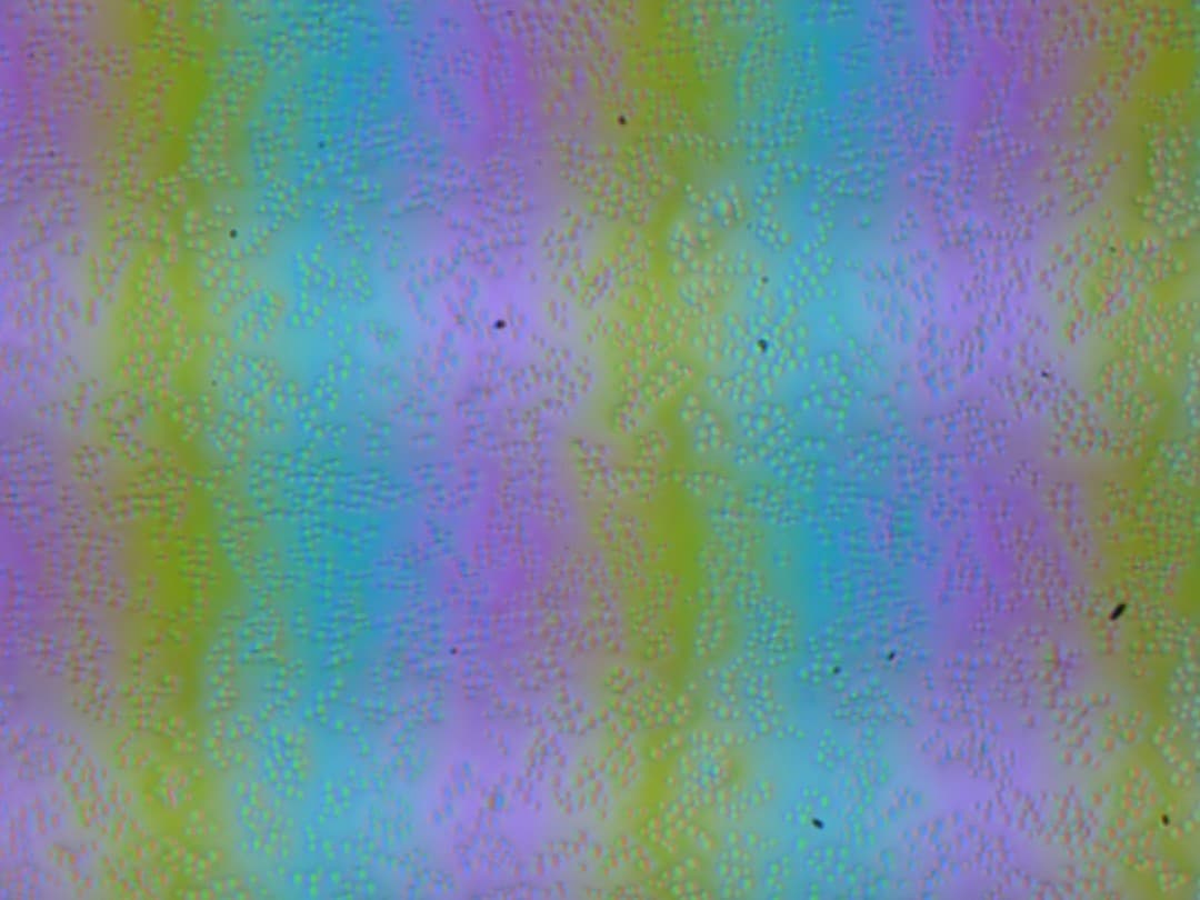 Зерно этих дефектов в несколько раз меньше размеров субпикселей (масштаб этих двух фотографий примерно одинаковый), поэтому фокусировка на микродефектах и «перескок» фокуса по субпикселям при изменении угла зрения выражены слабо, из-за этого нет и «кристаллического» эффекта.