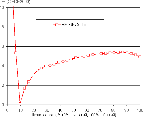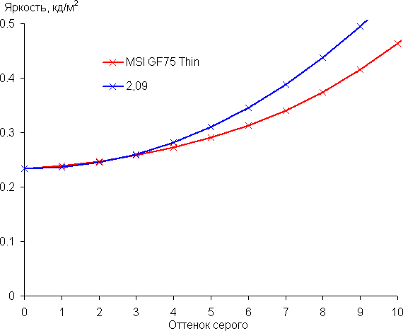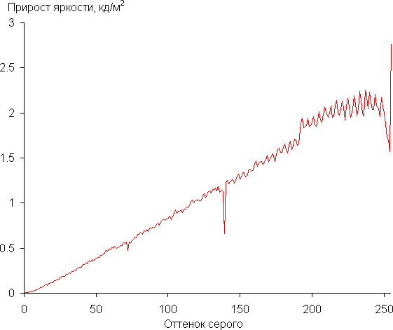 Далее мы измерили яркость 256 оттенков серого (от 0, 0, 0 до 255, 255, 255) при настройках по умолчанию. График ниже показывает прирост (не абсолютное значение!) яркости между соседними полутонами: