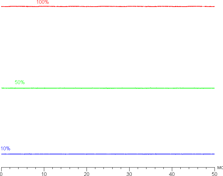 На любом уровне яркости значимая модуляция подсветки отсутствует, поэтому нет и никакого мерцания экрана. В доказательство приведем графики зависимости яркости (вертикальная ось) от времени (горизонтальная ось) при различных значениях настройки яркости: