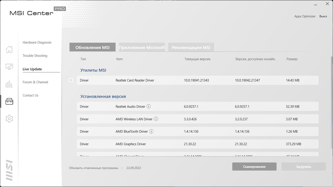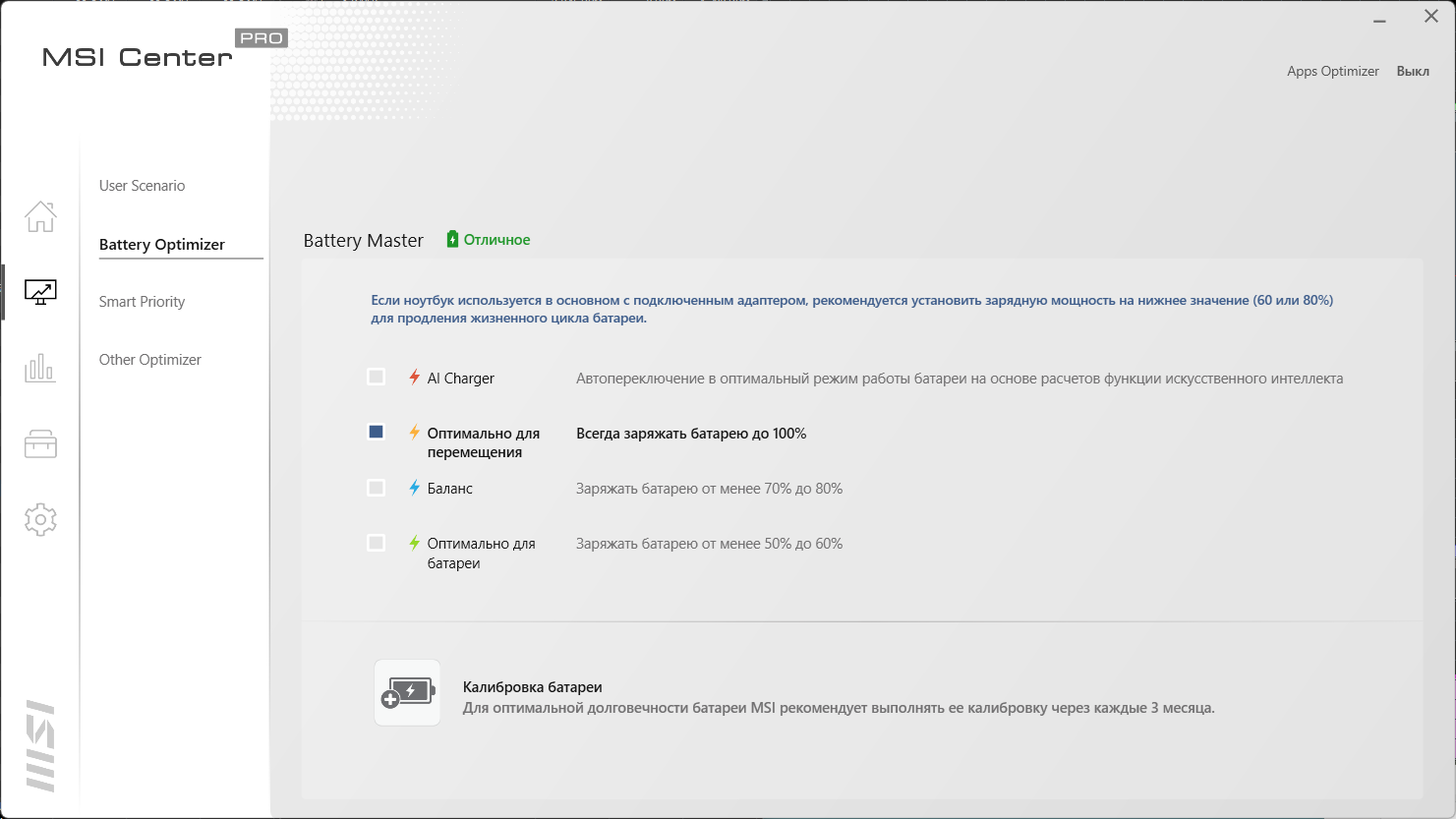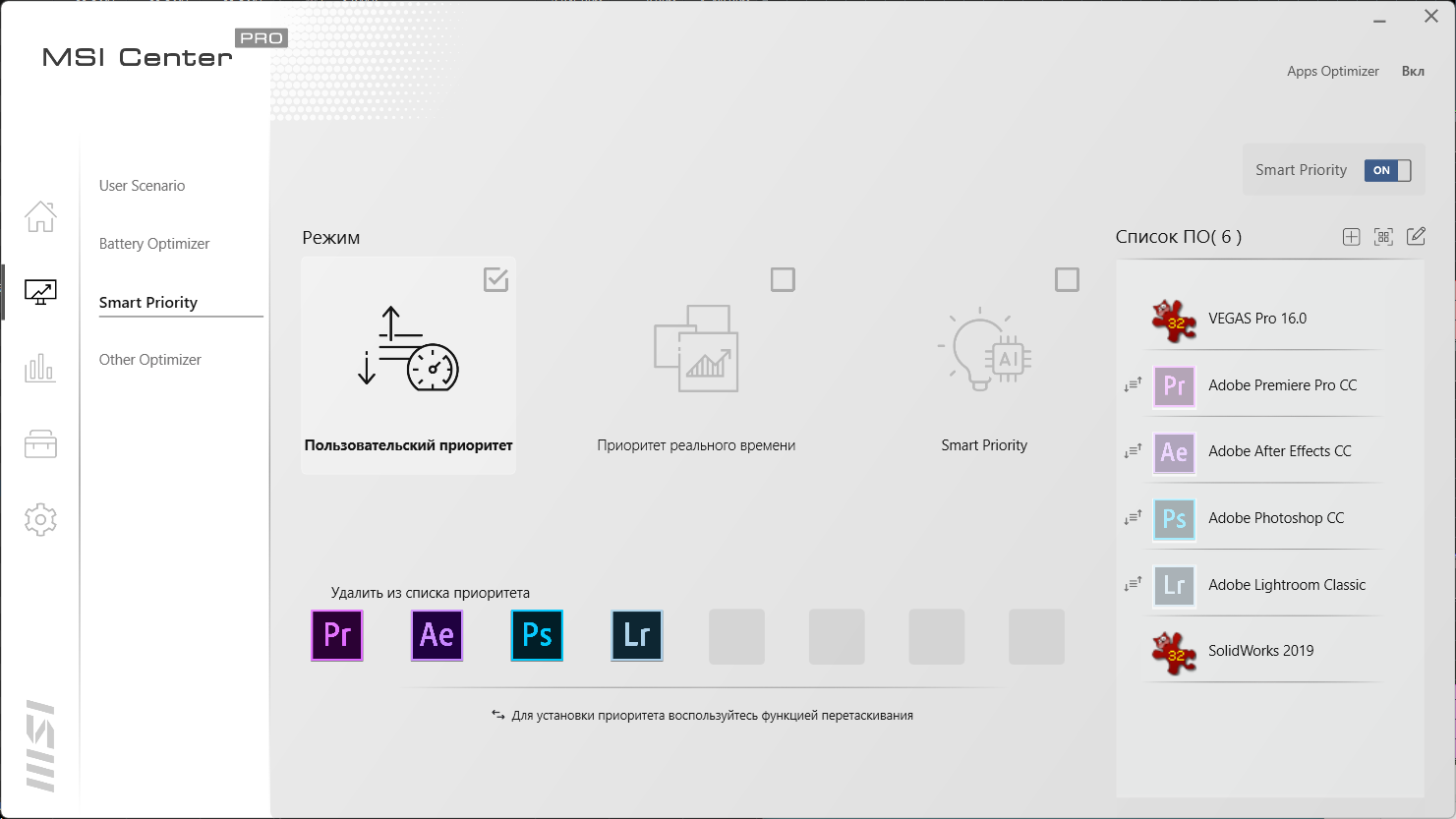 Ноутбук поставляется с Windows 11 Домашней редакции, доступен вариант без ОС, а MSI рекомендует профессиональную редакцию Windows. Фирменная утилита MSI Center всего одна, в данном случае она получила приставку Pro, чтобы отразить некую «рабочую» функциональность. Мы из таковой нашли только возможность выставить приоритет выполнения выбранных пользователем приложений.