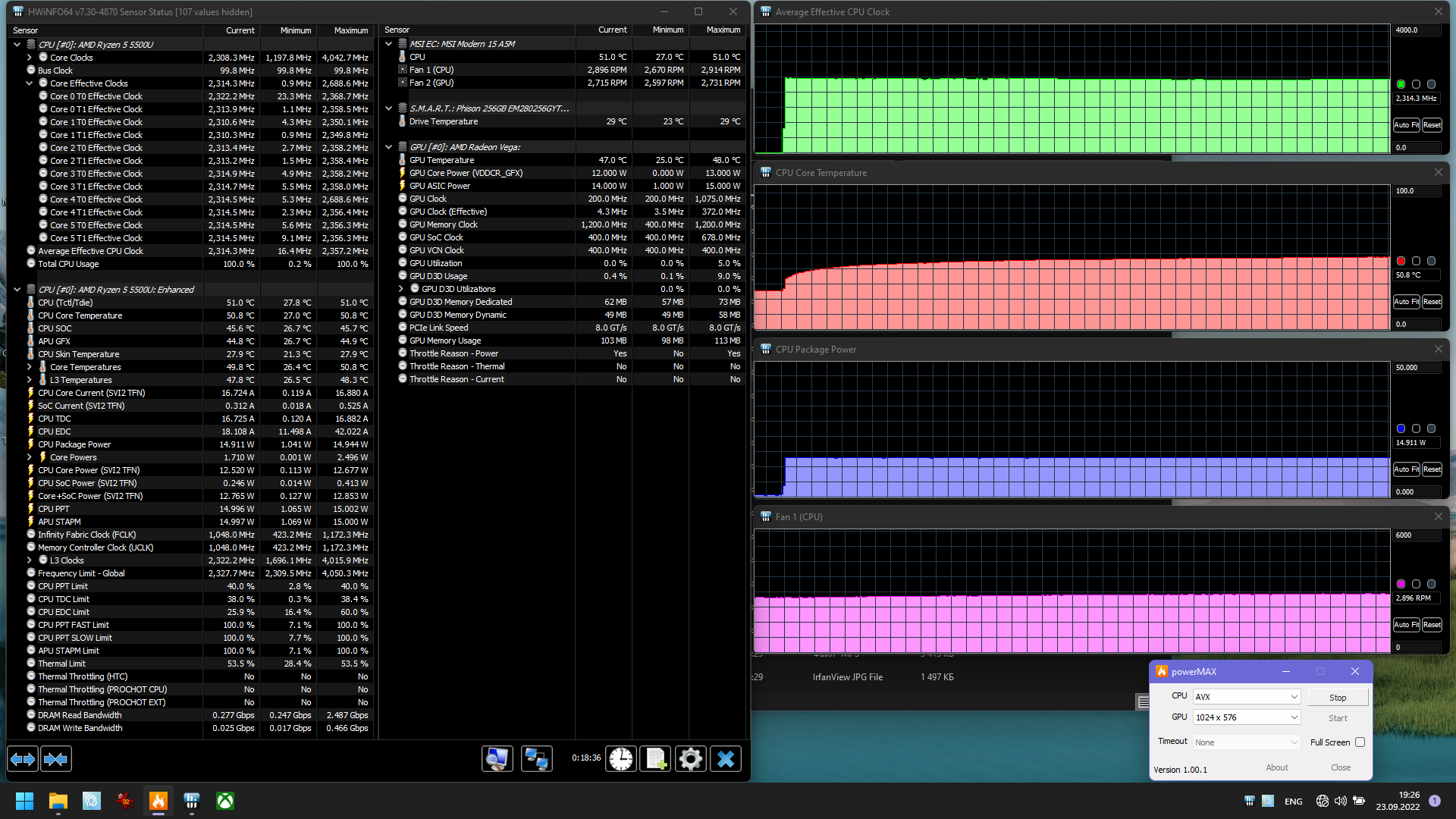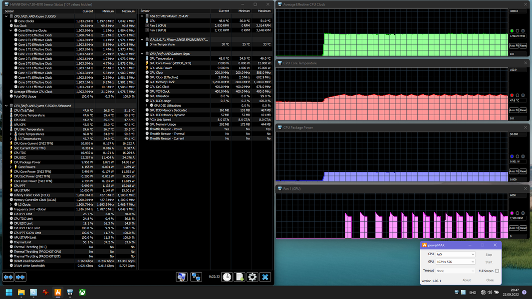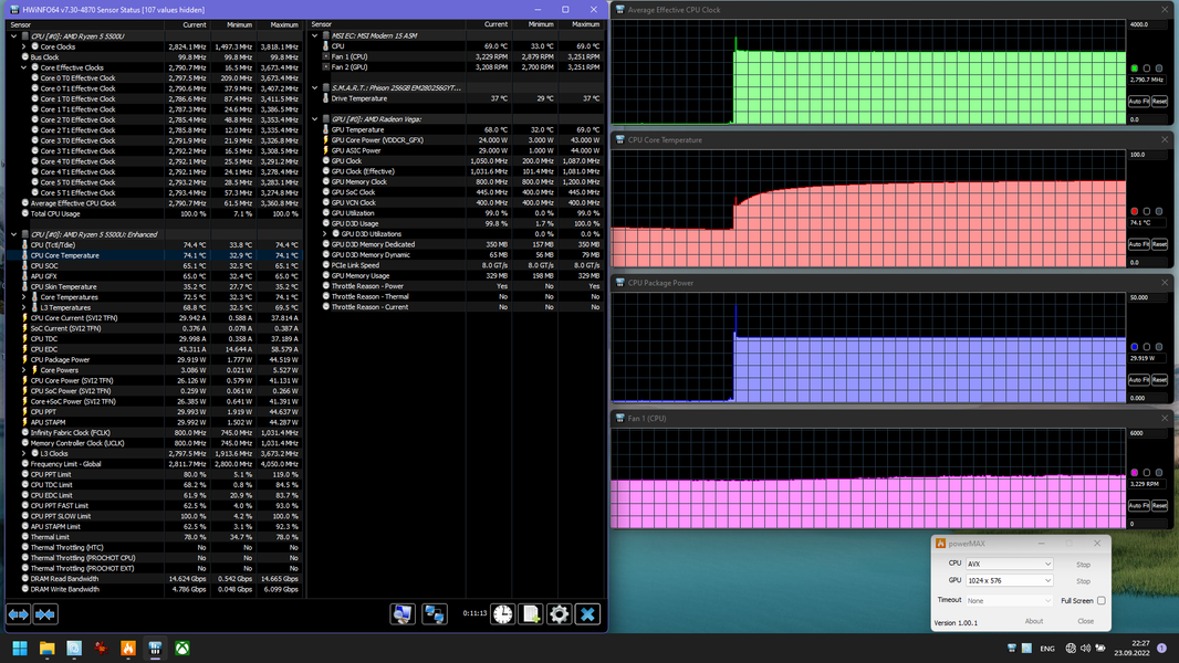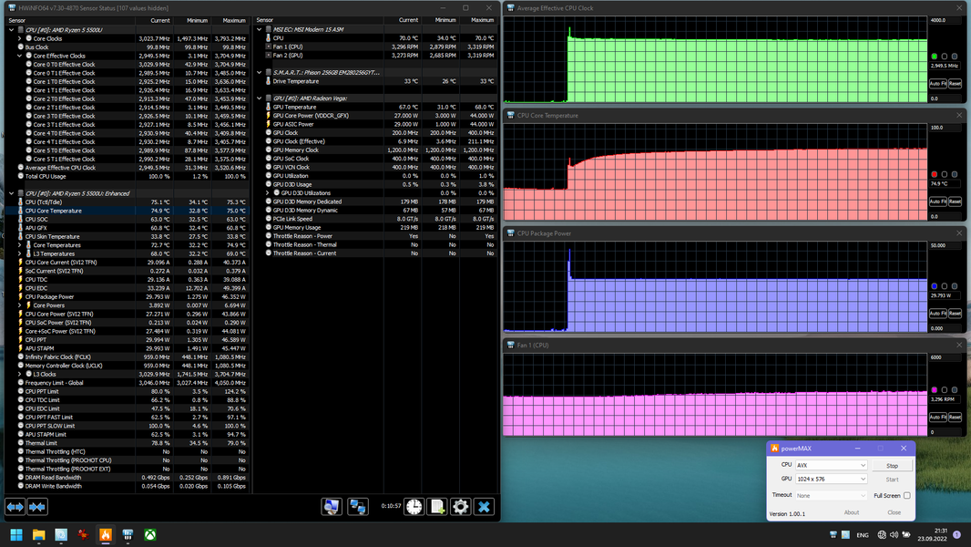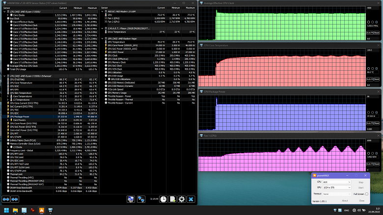 Основной профиль (сценарий) для режима, когда требуется высокая производительность, так и называется. В нем процессор под нагрузкой потребляет ровно 30 Вт (не считая секундного всплеска в момент подачи нагрузки), что превышает пределы, определенные AMD, но для ноутбуков это совершенно нормальное явление. Пара кулеров, о которых мы сказали, спокойно справляется с охлаждением процессора в этом режиме, его температура не поднимается даже до 80 градусов, а шум остается невысоким.