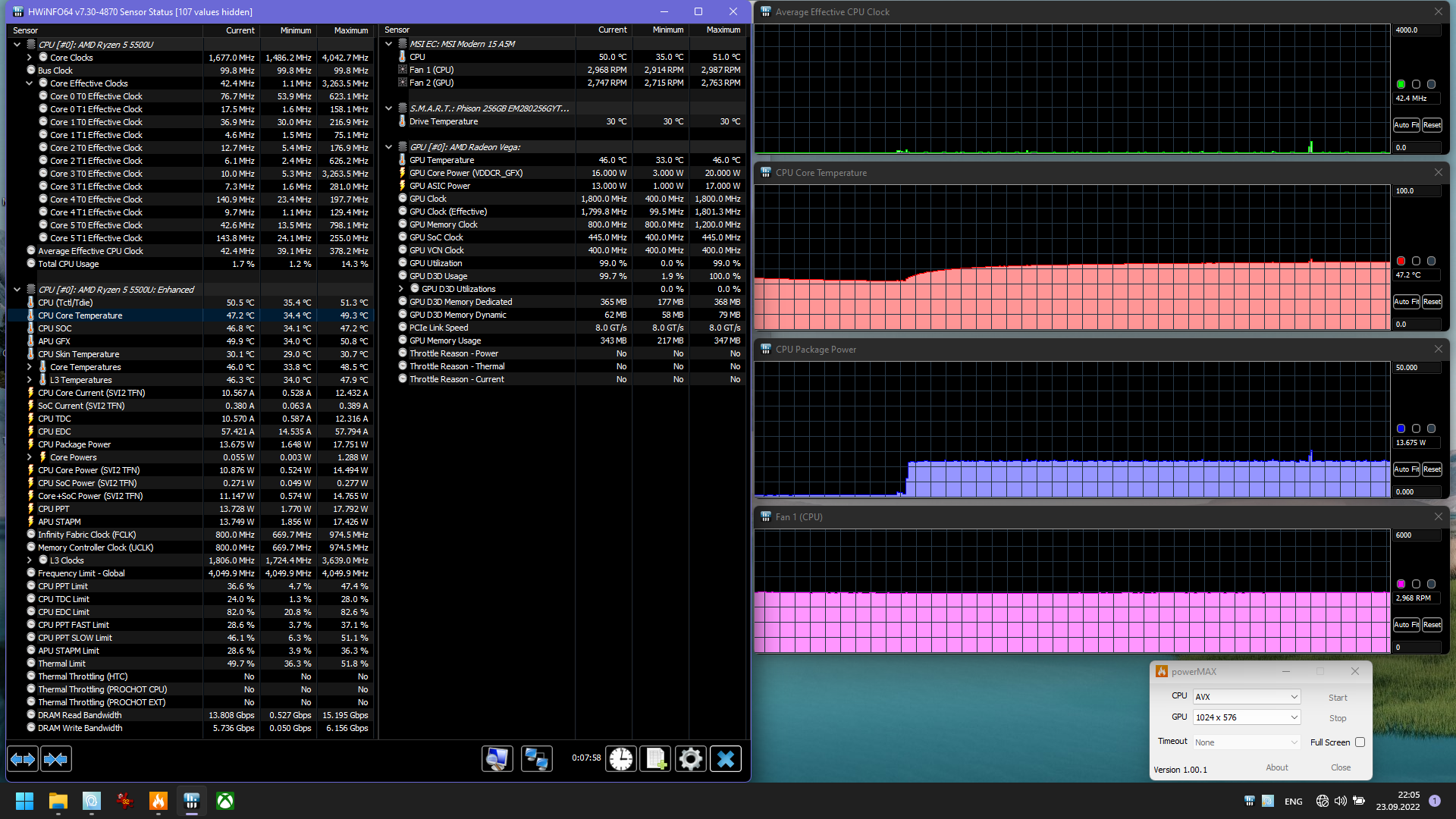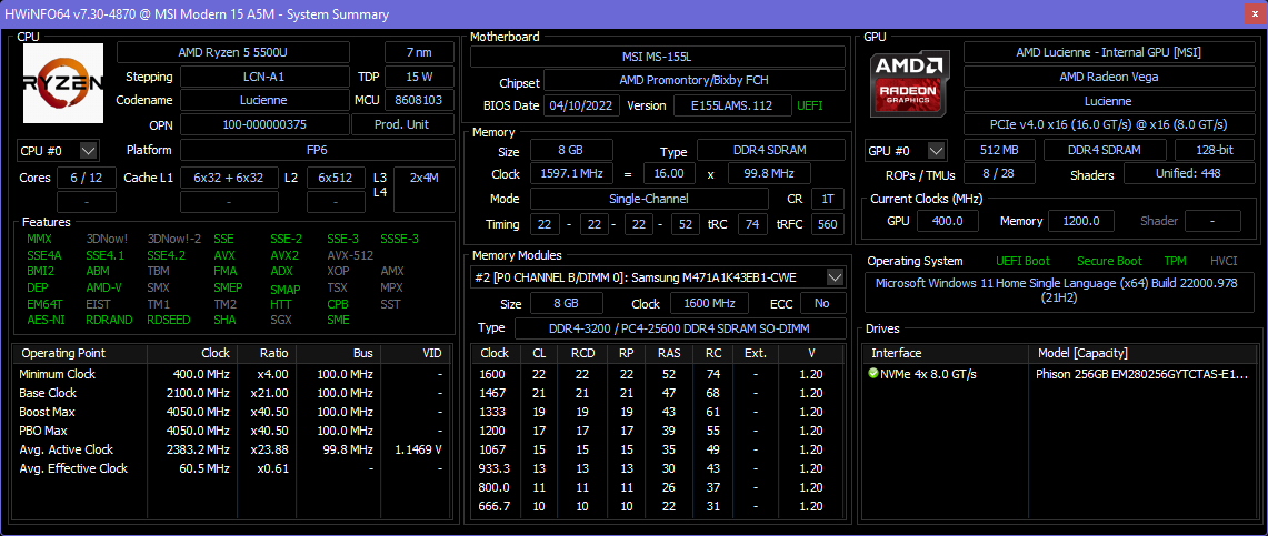 На наш взгляд, выбор Ryzen 5 5500U и конфигурации памяти для этого ноутбука осуществлялся без намерения поразить производительностью. Скорее всего, это самый дешевый и самый экономичный процессор, который имелся в арсенале MSI и который пора уже было куда-то пристроить. Поэтому же и память установлена одним 8-гигабайтным модулем: не для того даже, чтобы облегчить пользователю апгрейд — просто это дешевый и уже теряющий актуальность вариант, все переходят на DDR5, а на скорость в данном случае плевать.