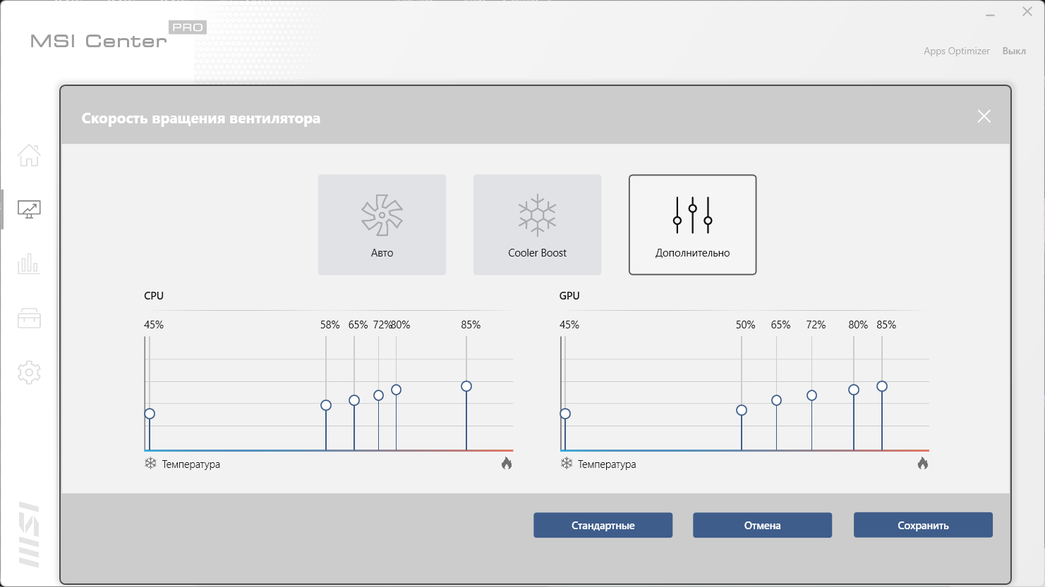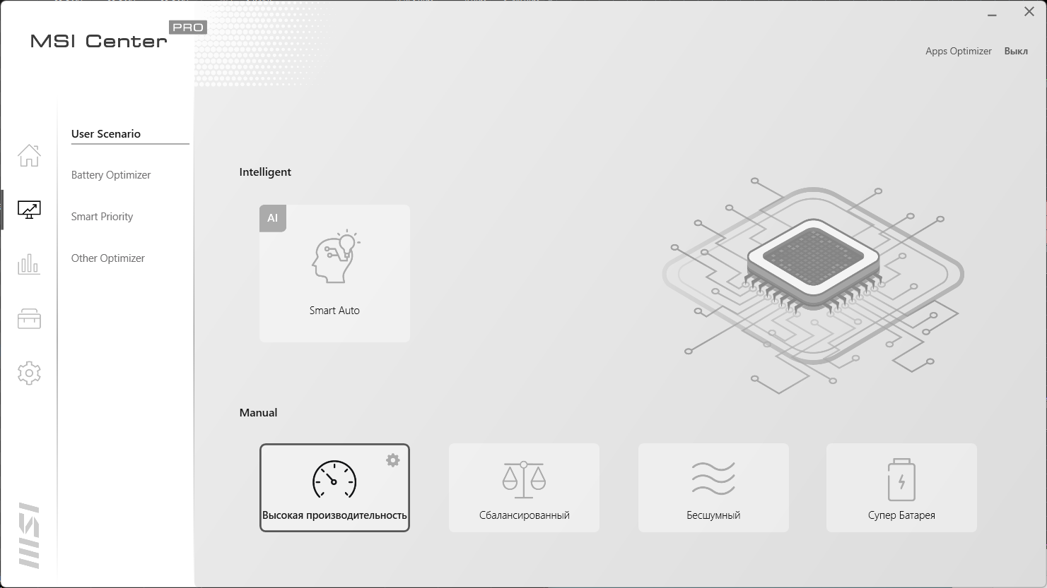 Традиционно, ключевая функция MSI Center — выбор сценария (профиля) работы комплектующих и системы охлаждения. Всего утилита предлагает 4 готовых сценария с очевидными названиями и, за одним исключением, без возможности настройки, а также автоматический сценарий, в котором параметрами рулит ИИ. Полностью пользовательского сценария нет, лишь в самом производительном можно выбрать режим работы кулеров: автоматический, максимальный или задать кривую работы кулеров по нескольким точкам. Подробнее о штатных сценариях мы поговорим в разделе тестирования под нагрузкой. Быстрый перебор сценариев осуществляется по Fn+F7.