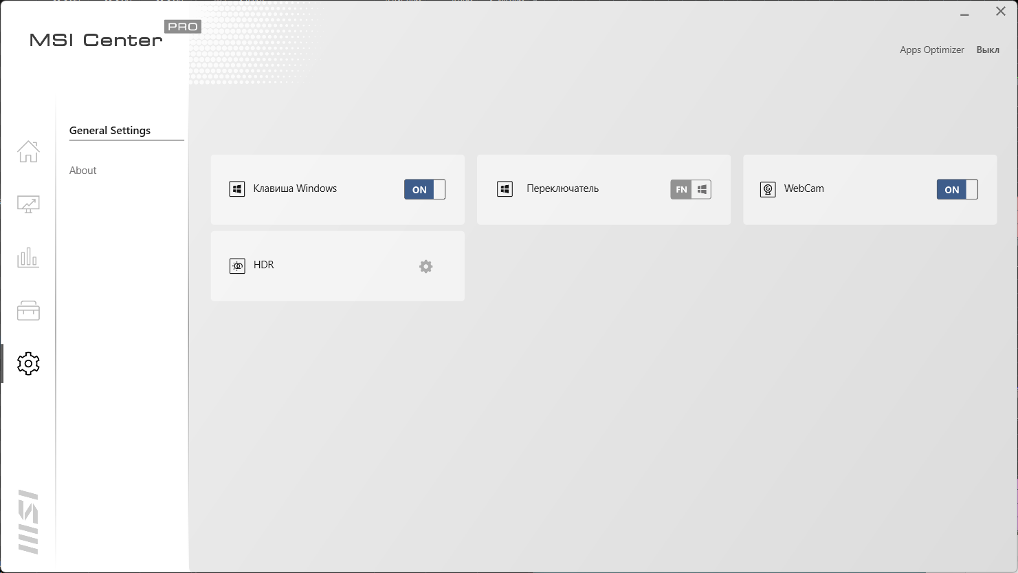 Также утилита обеспечивает широкий набор всевозможных тестов для обнаружения проблем с «железом», выдачу справочной информации, поиск обновлений как фирменного ПО, так и драйверов. Есть несколько полезных системных настроек: можно отключить клавишу Win, поменять местами Win и Fn, включить веб-камеру и HDR-режим работы экрана.