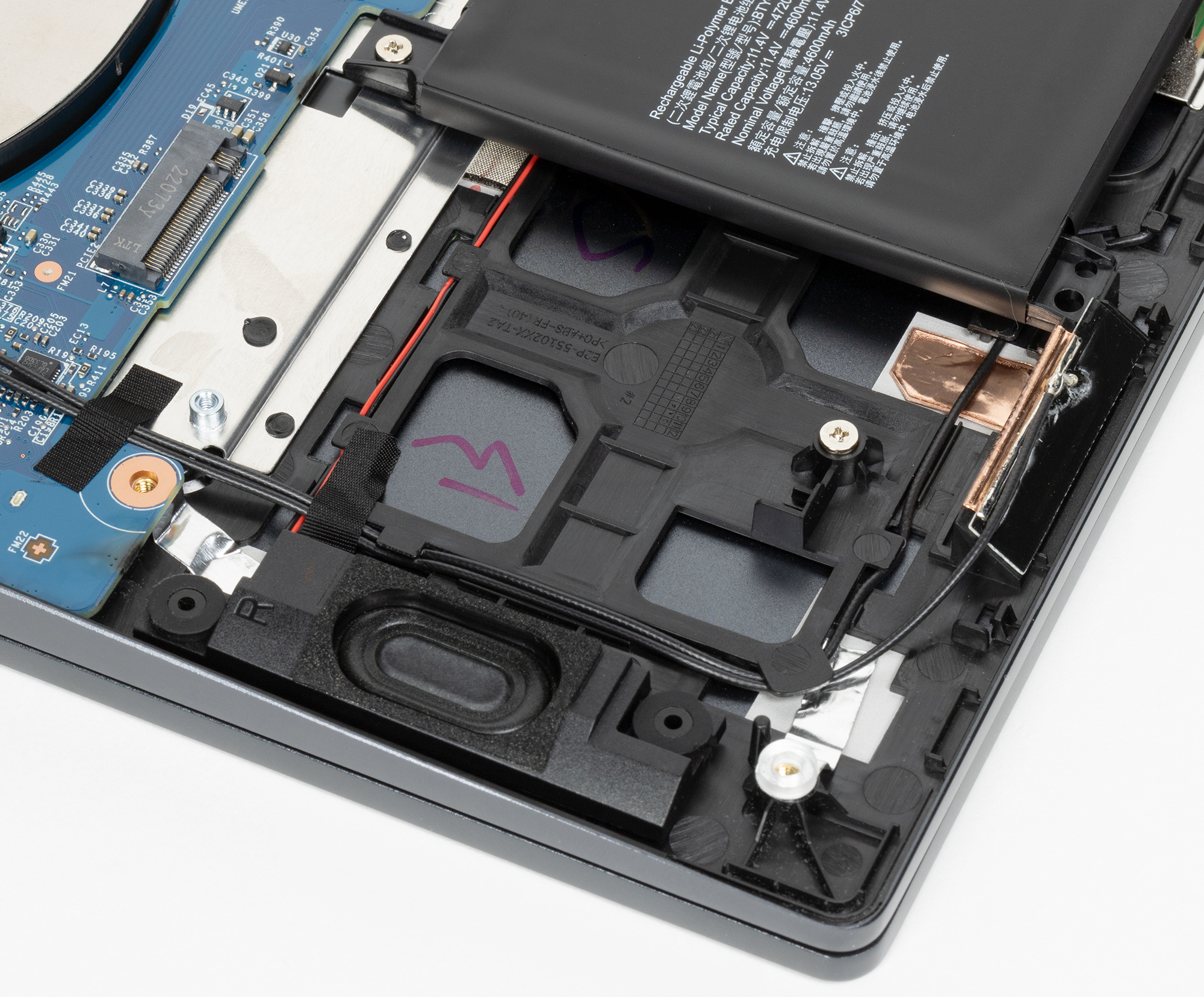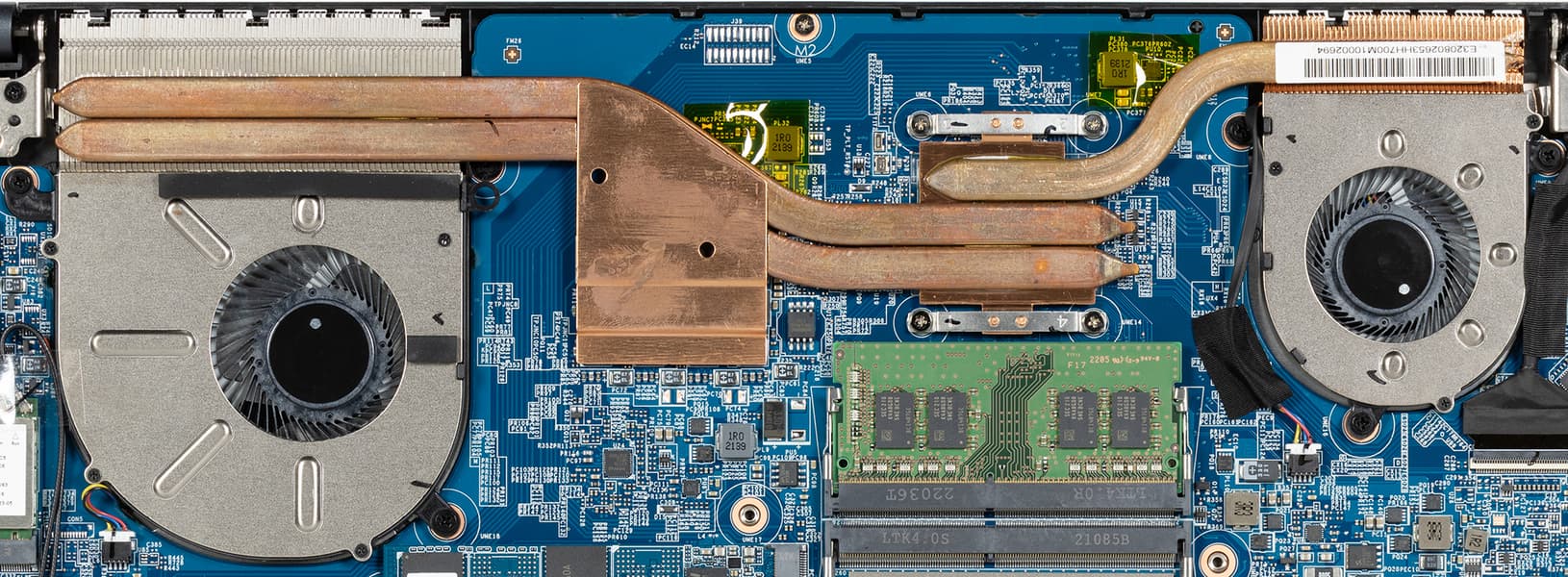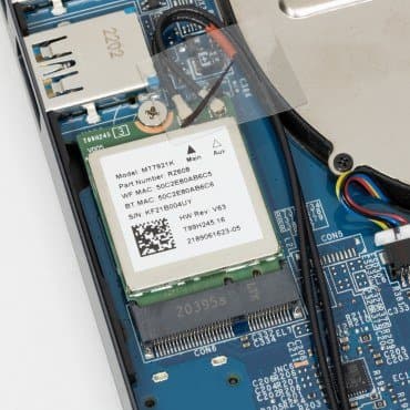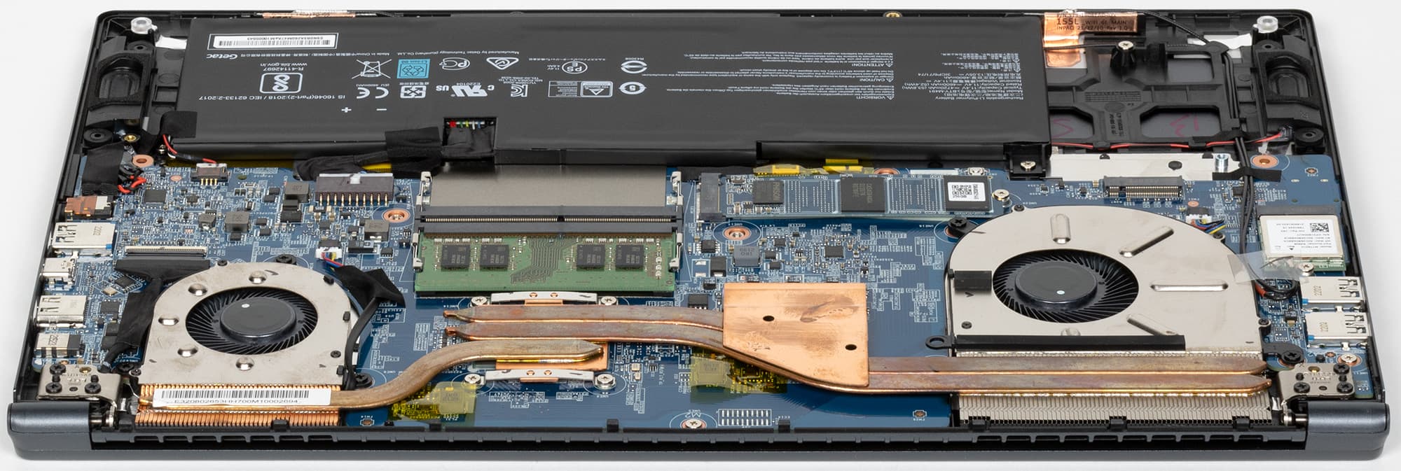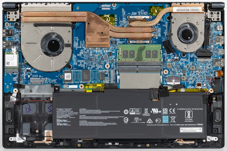 Сняв нижнюю панель корпуса, можно получить доступ к кулерам, батарее, съемному беспроводному сетевому адаптеру, SSD-накопителю в слоте M.2 и единственному модулю памяти в слотах SO-DIMM. Имеется еще один слот M.2, в который можно установить второй накопитель. Также есть возможность легко проапгрейдить память.