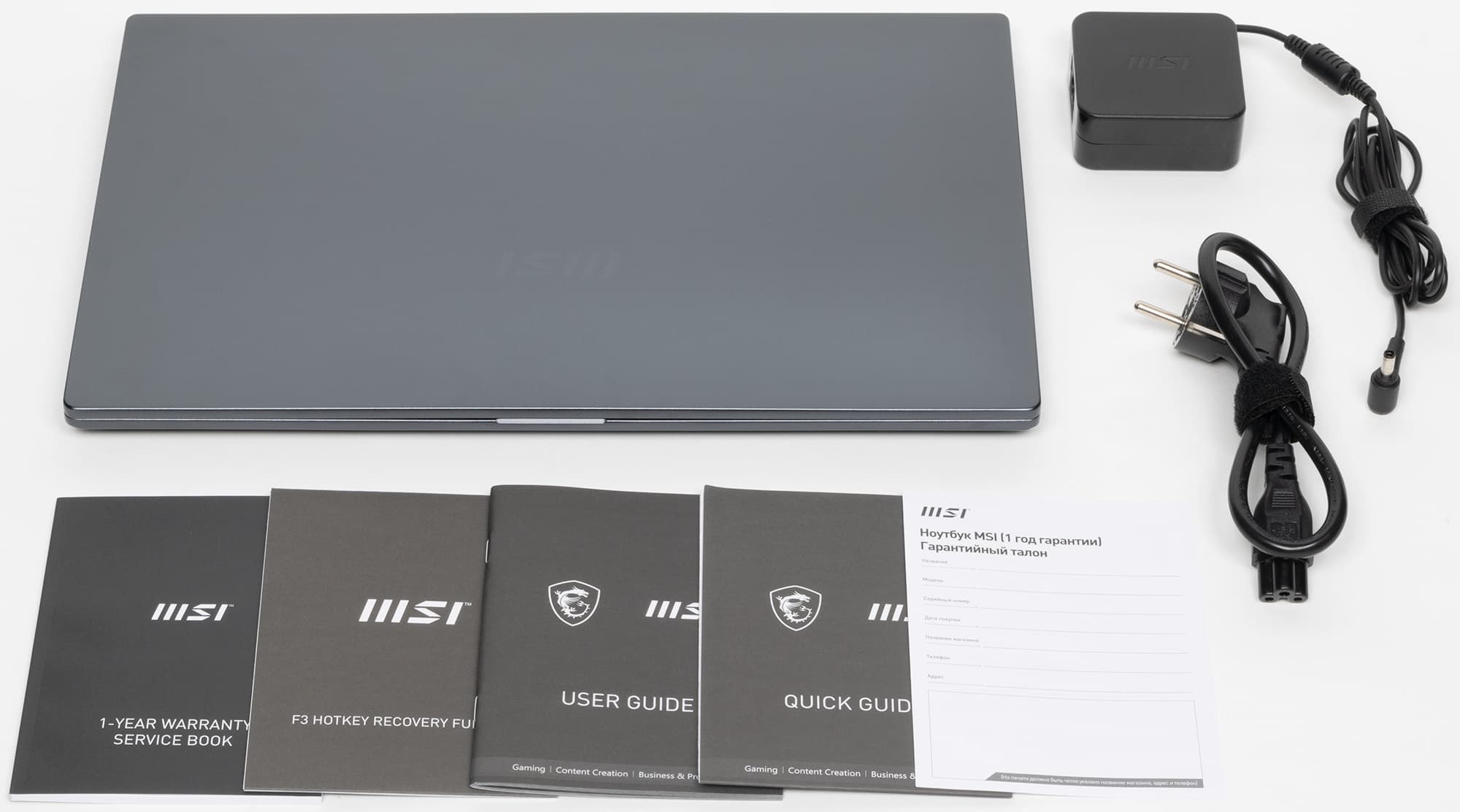В комплекте с ноутбуком, не считая бумажной документации, можно найти только очень компактный и легкий адаптер питания (всего 194 г) на 65 Вт с суммарной длиной двух кабелей чуть больше 2 м. К сожалению, разъем питания у ноутбука проприетарный, а не USB Type-C, то есть адаптер не универсальный.