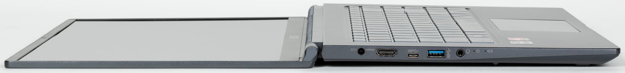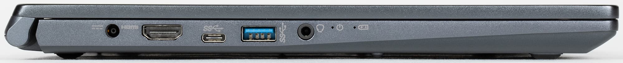 На левом боку есть разъем под фирменный штекер питания, полноразмерный HDMI с выводом изображения не выше 4K@30 Гц, USB3 Gen2 Type-C и USB3 Gen2 Type-A, а также универсальный миниджек для подключения гарнитуры. Рядом располагаются индикаторы — включенного состояния и зарядки.