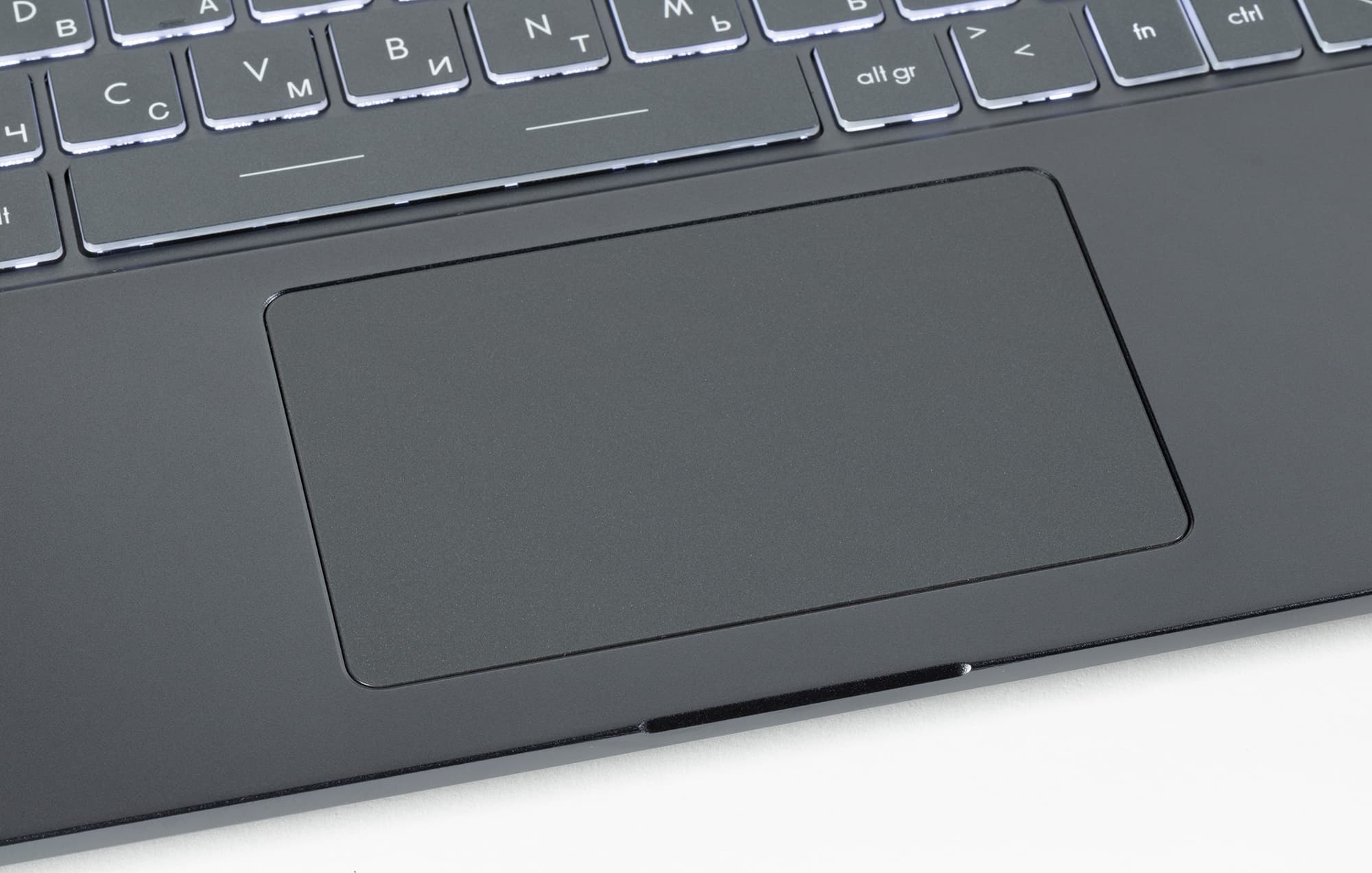 Ноутбук 15-дюймовый, но клавиатуру с цифровым блоком здесь размещать не стали: сделали столбик клавиш для редактирования текста справа и оставили заметные поля по бокам (так корпус удобнее держать за боковины). Зато кнопки основной части даже немного увеличены, до 16,5×16,5 мм (с просветом 3 мм). Стрелочки имеют такой же размер и нормальное взаимное расположение. Традиционные претензии у нас есть к кнопкам нижнего ряда, там какой-то непонятный хаос: левый Ctrl огромный, справа Fn и Ctrl половинные, при этом зачем-то, как всегда, есть кнопка для ввода слэшей. Немного помогает то, что кнопки Win и Fn можно штатно поменять местами. Однако Home и End доступны только с Fn.