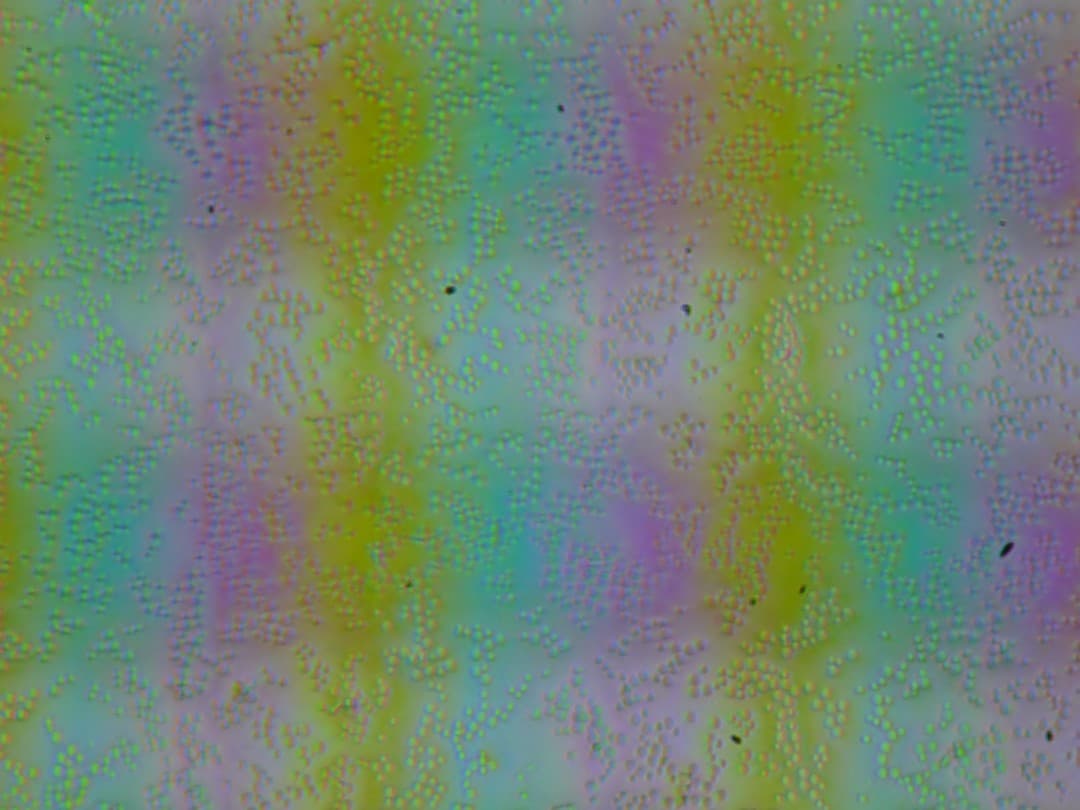 Зерно этих дефектов в несколько раз меньше размеров субпикселей (масштаб этих двух фотографий примерно одинаковый), поэтому фокусировка на микродефектах и «перескок» фокуса по субпикселям при изменении угла зрения выражены слабо, из-за этого нет и «кристаллического» эффекта.