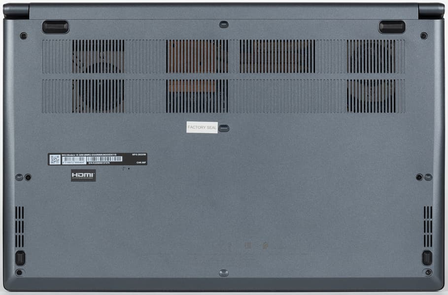 Это точно не громоздкий игровой ноутбук весом под 2,5 кг, но все же 1,63 кг у MSI Modern 15 A5M — это заметно больше, чем у ультрабуков, даже с металлическим корпусом весящих 1,2-1,3 кг. Толщина корпуса без ножек составляет 19 мм: опять же, это значительно меньше, чем у игровых машин, но больше, чем у ультрабуков, у которых толщина может быть меньше 15 мм. Да, здесь экран 15,6″, но над поверхностью матрицы нет стекла. Да, корпус частично пластиковый, но и система охлаждения усиленная. В общем, компромисс вполне разумный, и если смотреть не на рекорды, а на субъективные ощущения, то ноутбук нам внешне понравился. Хотя иногда ощущается разрыв шаблона, когда руки после металлической рабочей поверхности касаются чисто пластикового дна корпуса. К сборке претензий нет, корпус лишен щелей, не скрипит под пальцами, хотя жесткости крышки и особенно рабочей поверхности (особенно перед клавиатурой) немного не хватает.