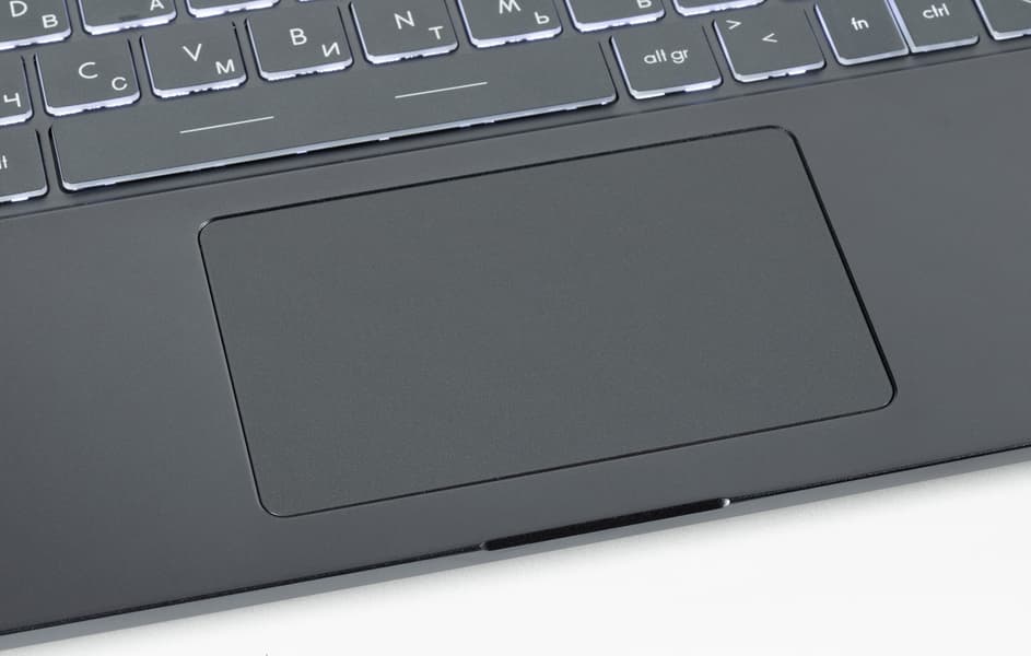 Тачпад очень небольшой (106×66 мм) и, к сожалению, с типичными для ноутбуков MSI проблемами с неравномерностью нажатия. Приходится переучиваться на работу касаниями и жестами, в таком режиме проблем нет, даже четыре пальца для горизонтальных взмахов на сенсорной поверхности, в принципе, умещаются. В углу тачпада может располагаться сканер отпечатков пальцев, но наша модификация его не имела.