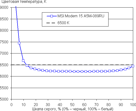 Баланс оттенков на шкале серого хороший, так как цветовая температура близка к стандартным 6500 К, и отклонение от спектра абсолютно черного тела (ΔE) ниже или слегка превышает 10, что для потребительского устройства считается приемлемым показателем. При этом цветовая температура и ΔE мало изменяются от оттенка к оттенку — это положительно сказывается на визуальной оценке цветового баланса. (Самые темные области шкалы серого можно не учитывать, так как там баланс цветов не имеет большого значения, да и погрешность измерений цветовых характеристик на низкой яркости большая.)