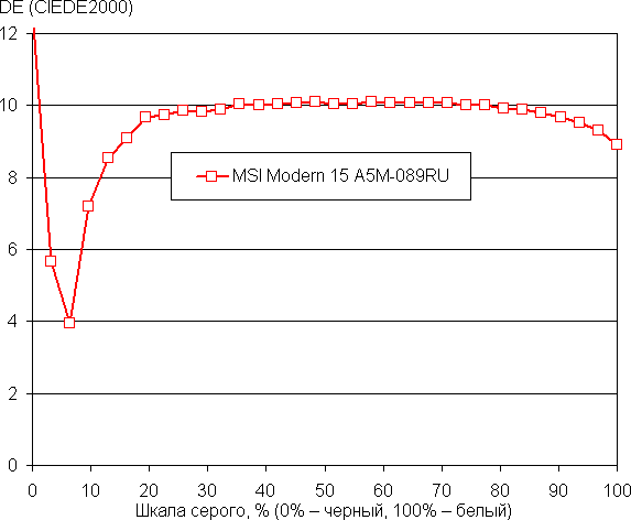 Рост прироста яркости на большей части шкалы серого равномерный, и каждый следующий оттенок ярче предыдущего. Однако в светах это не так, и три самых светлых оттенка серого по яркости от белого не отличаются. Впрочем, общей картины это не портит. В самой темной области аппаратно и визуально различаются все оттенки:
