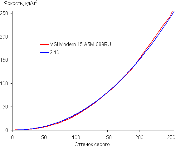 Аппроксимация полученной гамма-кривой дала показатель 2,16, что чуть ниже стандартного значения 2,2, при этом реальная гамма-кривая немного отклоняется от аппроксимирующей степенной функции: