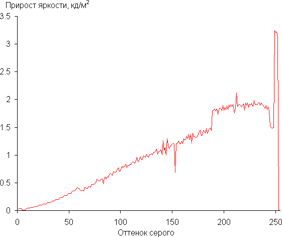 Далее мы измерили яркость 256 оттенков серого (от 0, 0, 0 до 255, 255, 255). График ниже показывает прирост (не абсолютное значение!) яркости между соседними полутонами: