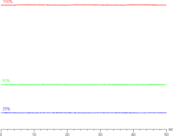 На любом уровне яркости значимая модуляция подсветки отсутствует, поэтому нет и никакого мерцания экрана (нет ШИМ). В доказательство приведем графики зависимости яркости (вертикальная ось) от времени (горизонтальная ось) при различных значениях настройки яркости: