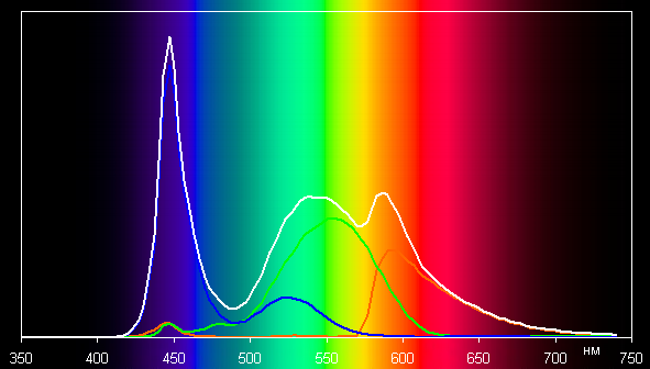 Поэтому визуально цвета на этом экране бледноваты. Ниже приведен спектр для белого поля (белая линия), наложенный на спектры красного, зеленого и синего полей (линии соответствующих цветов):