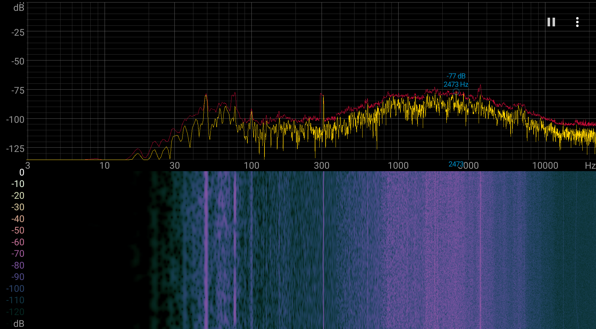 Если ноутбук не нагружать совсем, то его система охлаждения, по крайней мере в профиле Бесшумный, может работать в пассивном режиме, то есть бесшумно. Даже под большой нагрузкой шум от системы охлаждения умеренный, если не учитывать профиль Сбалансированный. В некоторых режимах шум может с периодом в десятки секунд повышаться и понижаться, это воспринимается хуже, чем просто неизменный уровень шума, пусть и на уровне максимального за период. Характер шума ровный и раздражения не вызывает. Спектрограмма, полученная для максимальной скорости вентиляторов, достаточно ровная, и в диапазоне частот, где звуки могут вызывать особенное раздражение, пиков с высокой интенсивностью нет (призвук на 300 Гц на фоне более высокочастотного шума на слух неразличим):