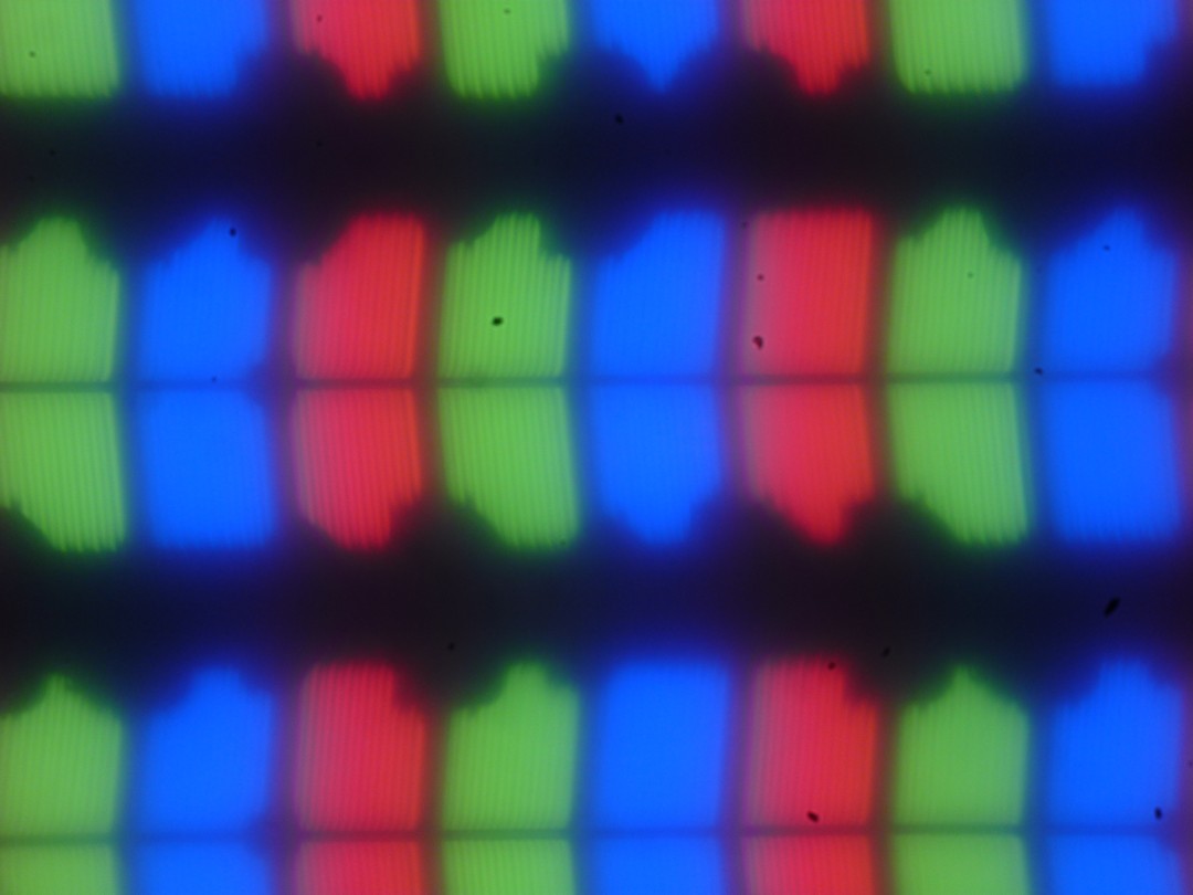 В этом ноутбуке используется матрица типа IPS. Микрофотографии демонстрируют типичную для IPS структуру субпикселей (черные точки — это пыль на матрице фотоаппарата):
