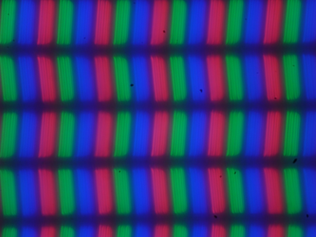 В MSI P65 Creator 9SF используется матрица типа IPS. Микрофотографии демонстрируют типичную для IPS структуру субпикселей (черные точки — это пыль на матрице фотоаппарата):