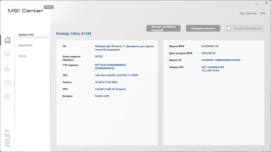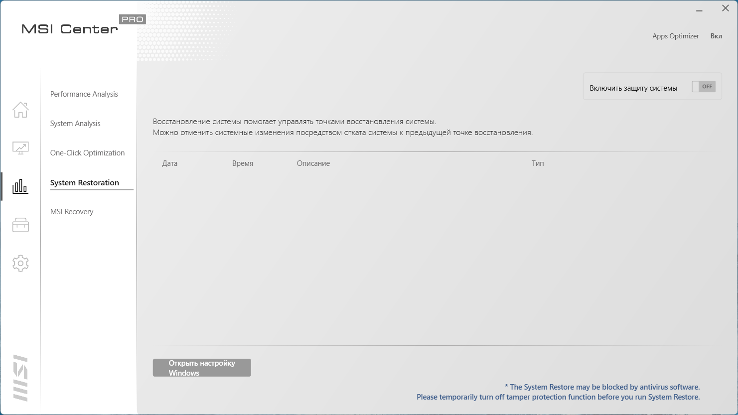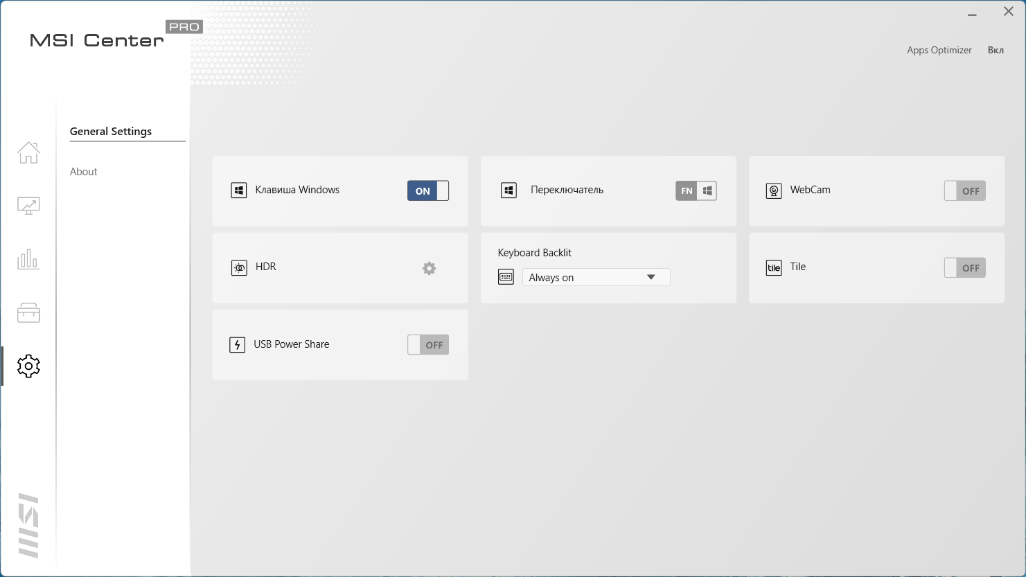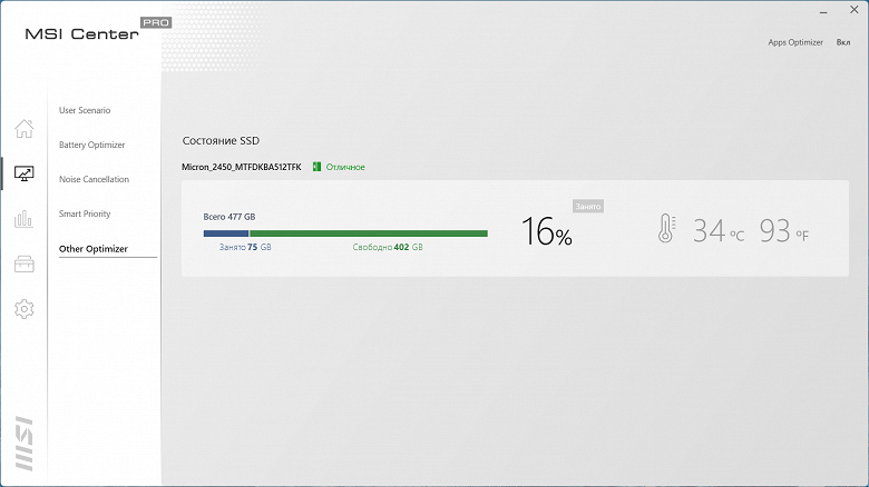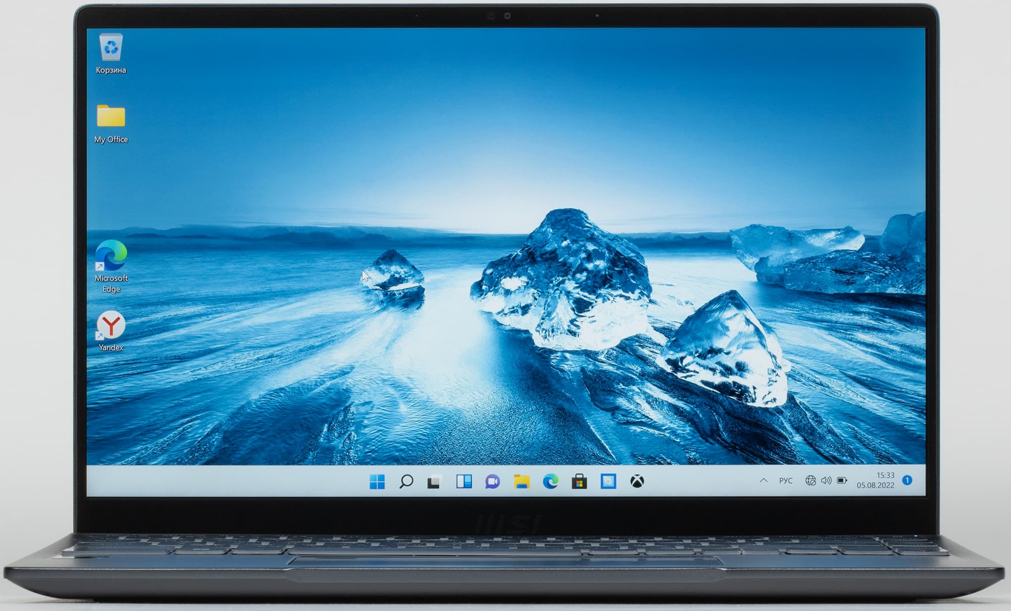 Ноутбук поставляется с ОС Windows 11 Home (домашней редакции), набором фирменных приложений, триал-версией MS Office и сетап-инициатором Yandex. Наиболее важным компонентом фирменного ПО является MSI Center.