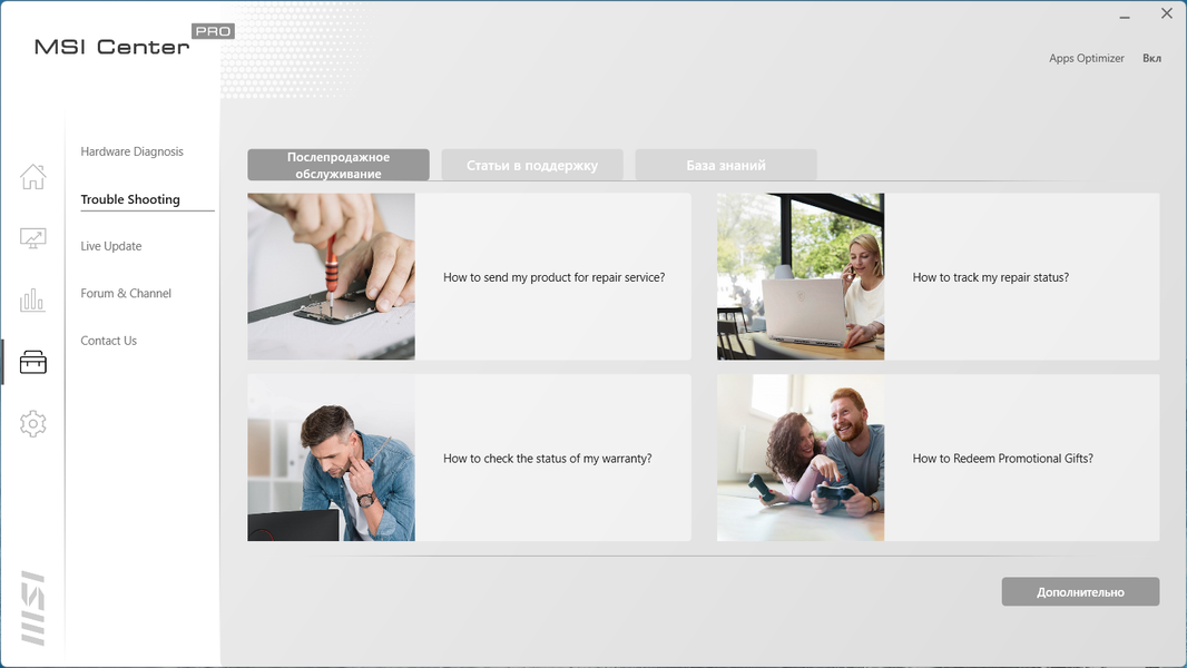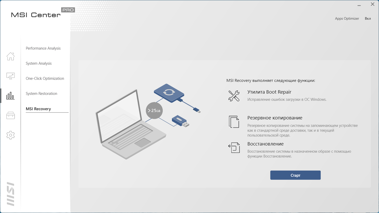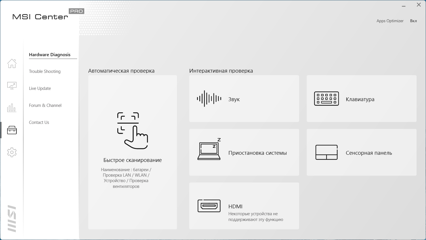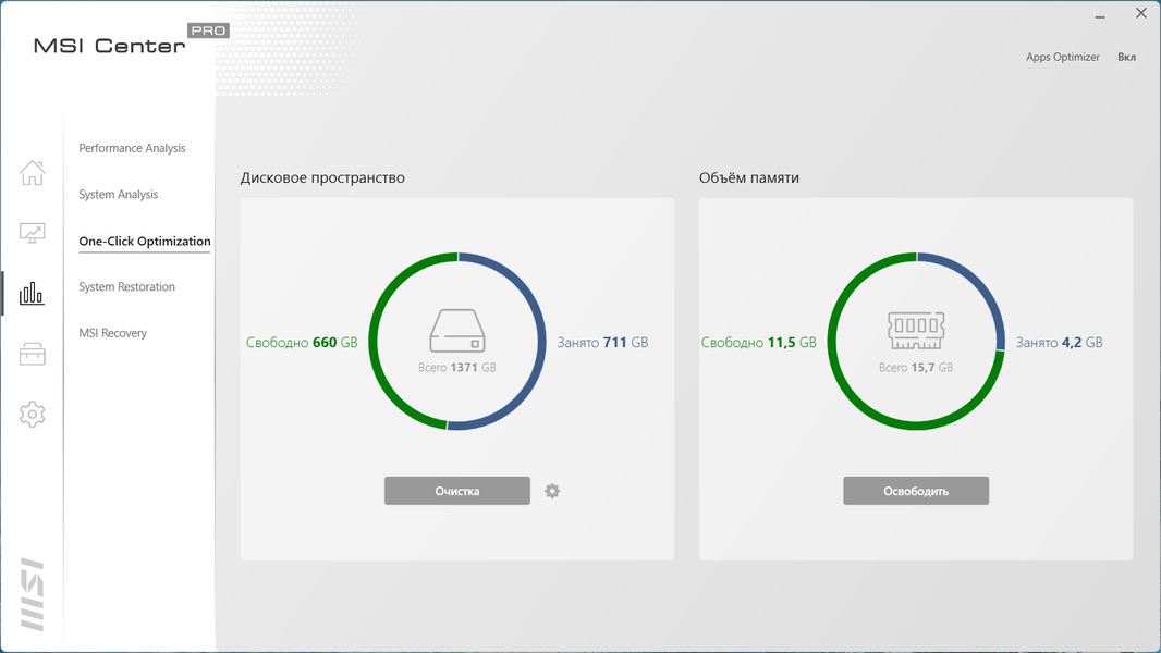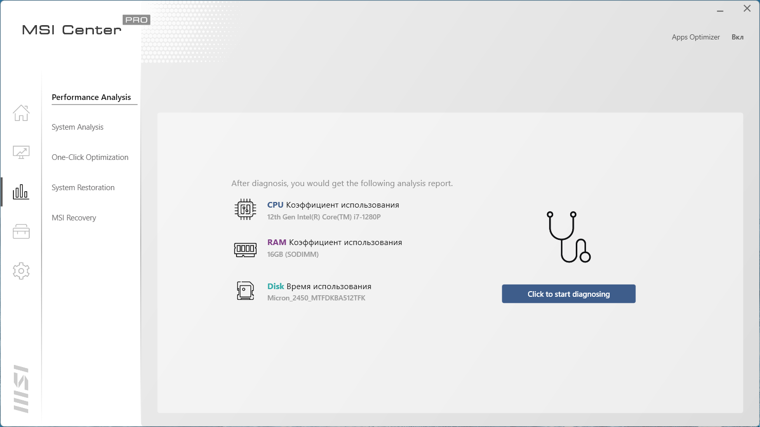 Ноутбук поставляется с ОС Windows 11 Home (домашней редакции), набором фирменных приложений, триал-версией MS Office и сетап-инициатором Yandex. Наиболее важным компонентом фирменного ПО является MSI Center.