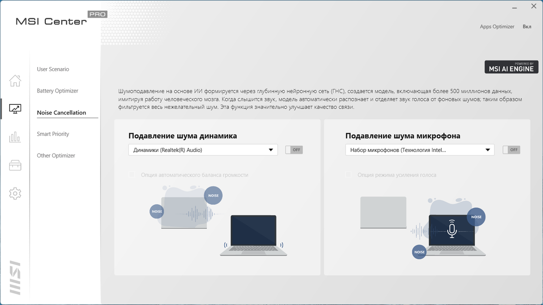 В этом же разделе можно активировать шумоподавление при воспроизведении звука и его записи на встроенные микрофоны.