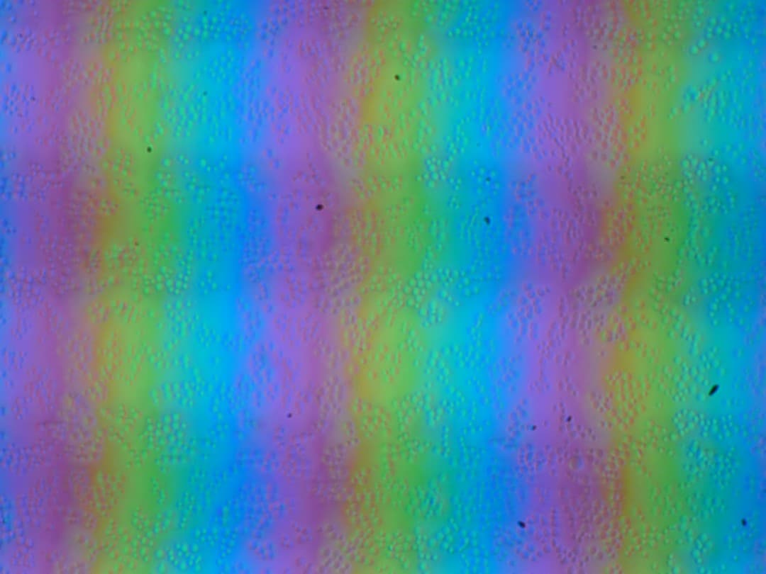 Зерно этих дефектов в несколько раз меньше размеров субпикселей (масштаб этих двух фотографий примерно одинаковый), поэтому фокусировка на микродефектах и «перескок» фокуса по субпикселям при изменении угла зрения выражены слабо, из-за этого нет и «кристаллического» эффекта.