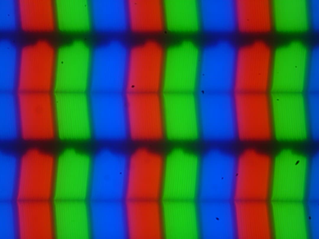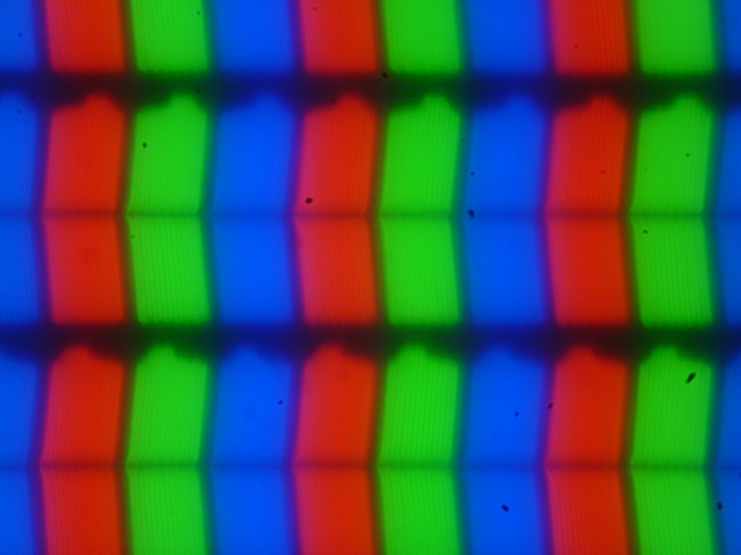 В этом ноутбуке используется матрица типа IPS. Микрофотографии демонстрируют типичную для IPS структуру субпикселей (черные точки — это пыль на матрице фотоаппарата):