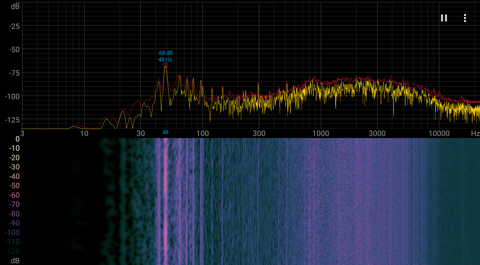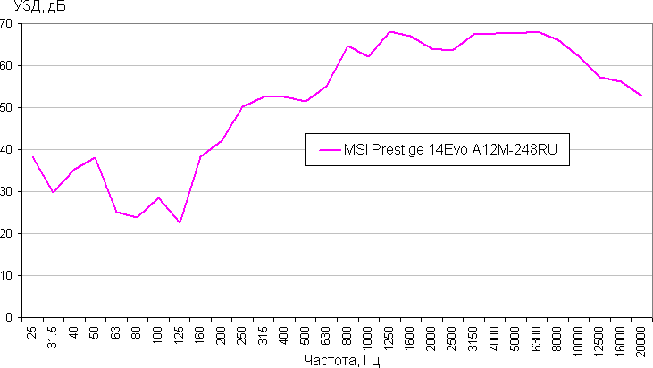 Если ноутбук не нагружать совсем, то его система охлаждения может работать в пассивном режиме, то есть бесшумно. При этом, если прижаться ухом к корпусу ноутбука, то будет заметно какое-то потрескивание («шум от электроники»), но уже на минимальном расстоянии ничего не слышно. Под большой нагрузкой шум от системы охлаждения умеренный. Характер шума ровный и раздражения не вызывает. Спектрограмма, полученная для максимальной скорости вентиляторов, достаточно ровная, и в диапазоне частот, где звуки могут вызывать особенное раздражение, выраженных пиков нет (низкочастотными пиками можно пренебречь):