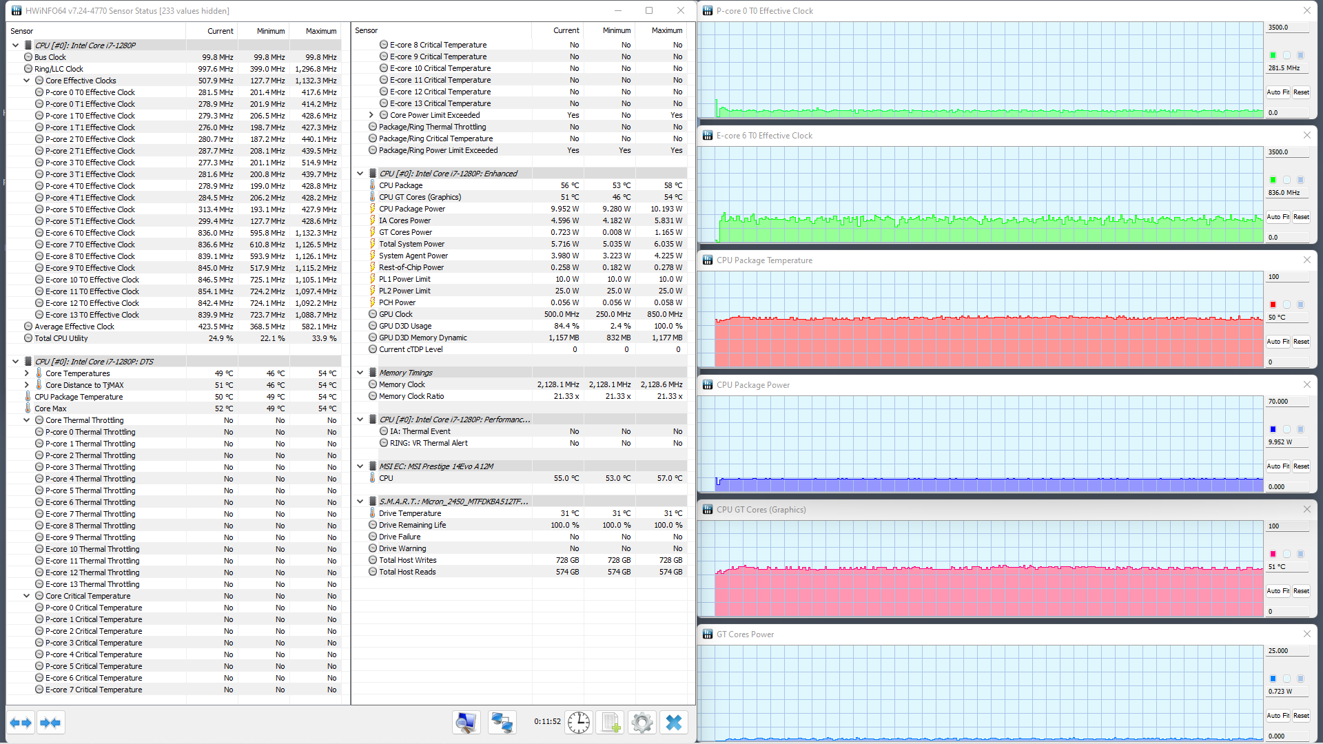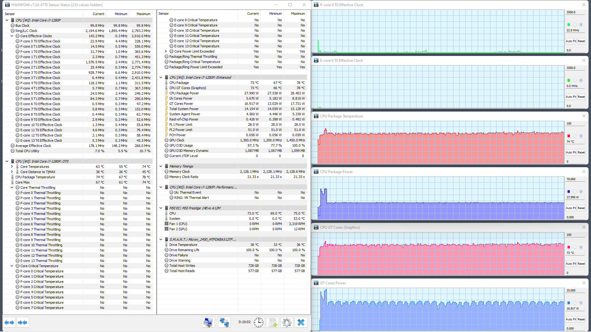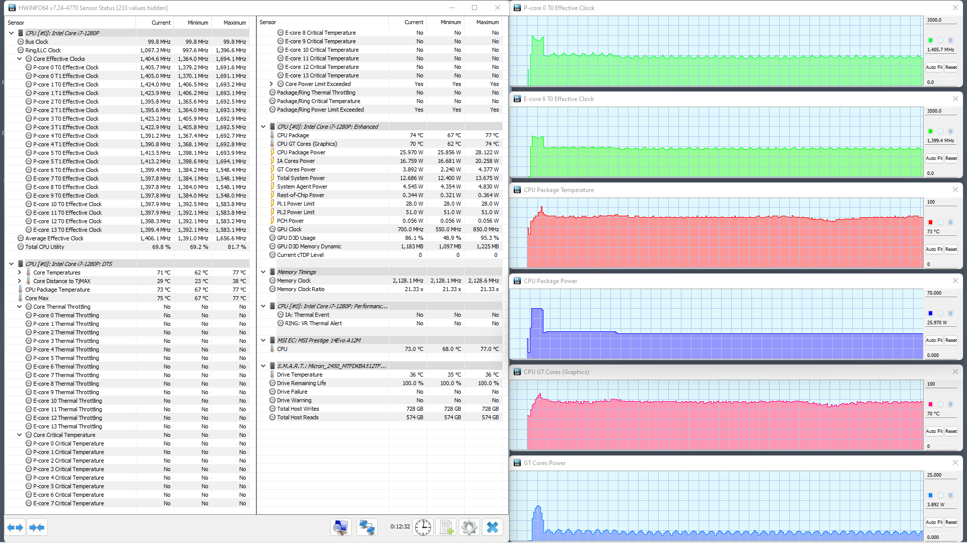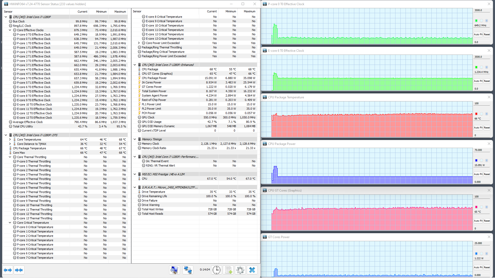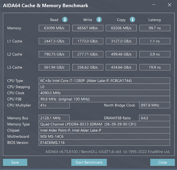 Напомним, что в MSI Prestige 14 Evo A12M-248RU установлен мобильный процессор Intel Core i7-1280P со штатным тепловыделением 28 Вт и 64 Вт в турборежиме. Этот чип объединяет в себе 14 ядер: