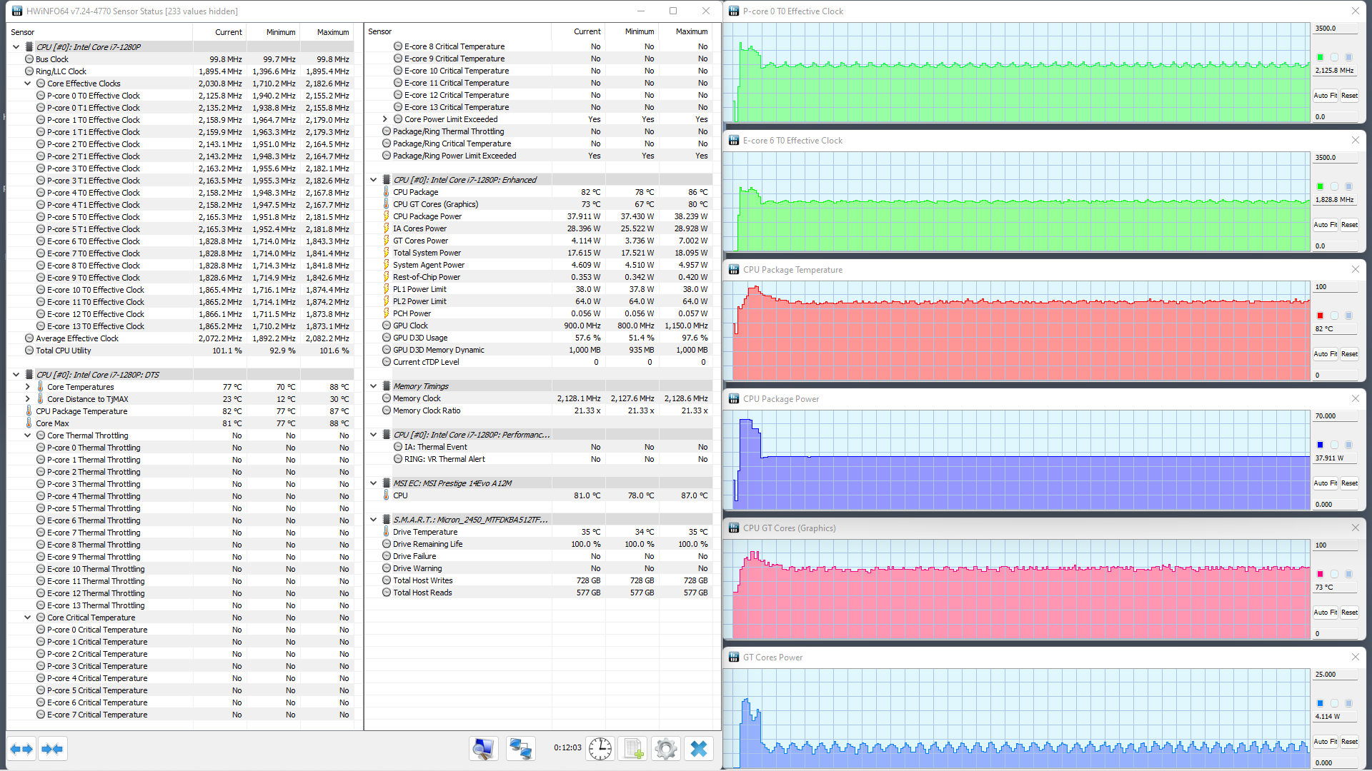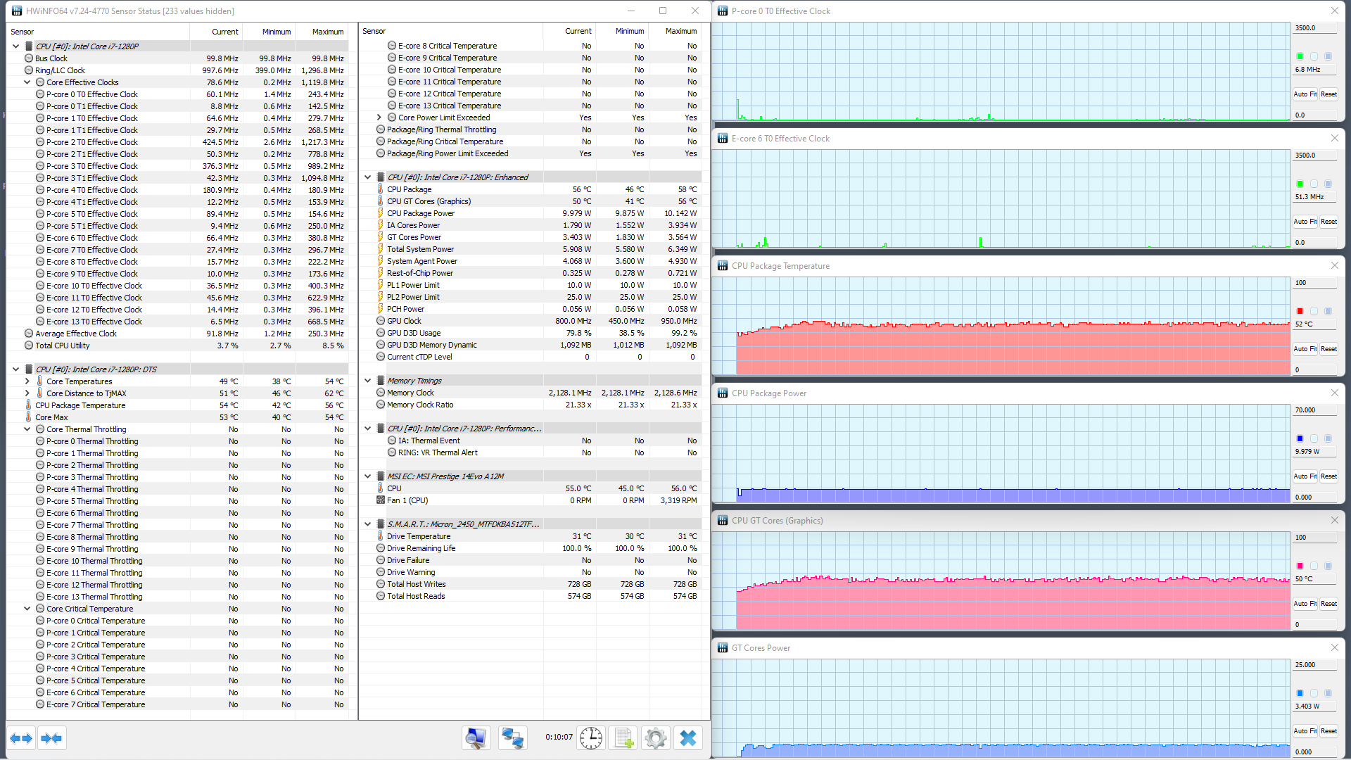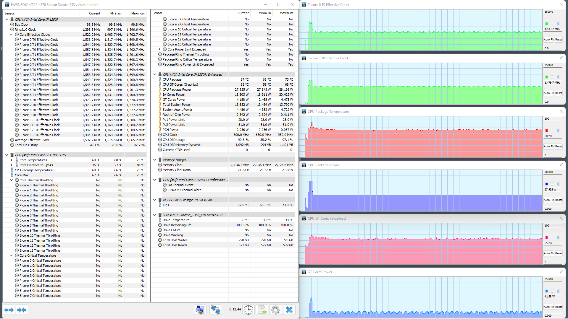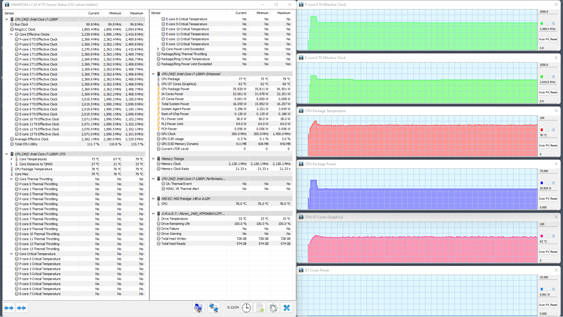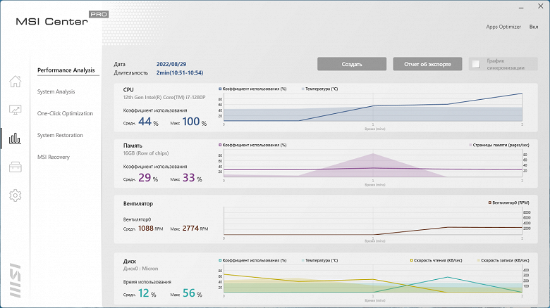 Напомним, что в MSI Prestige 14 Evo A12M-248RU установлен мобильный процессор Intel Core i7-1280P со штатным тепловыделением 28 Вт и 64 Вт в турборежиме. Этот чип объединяет в себе 14 ядер: