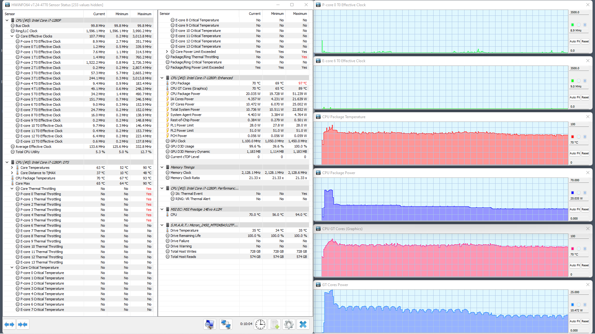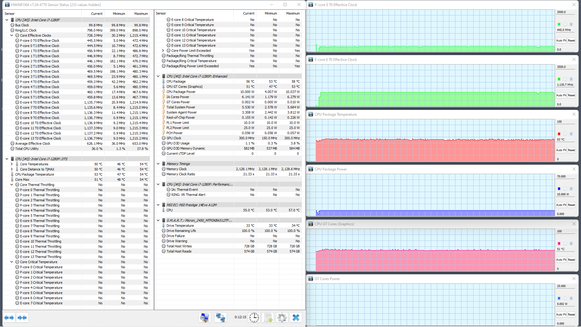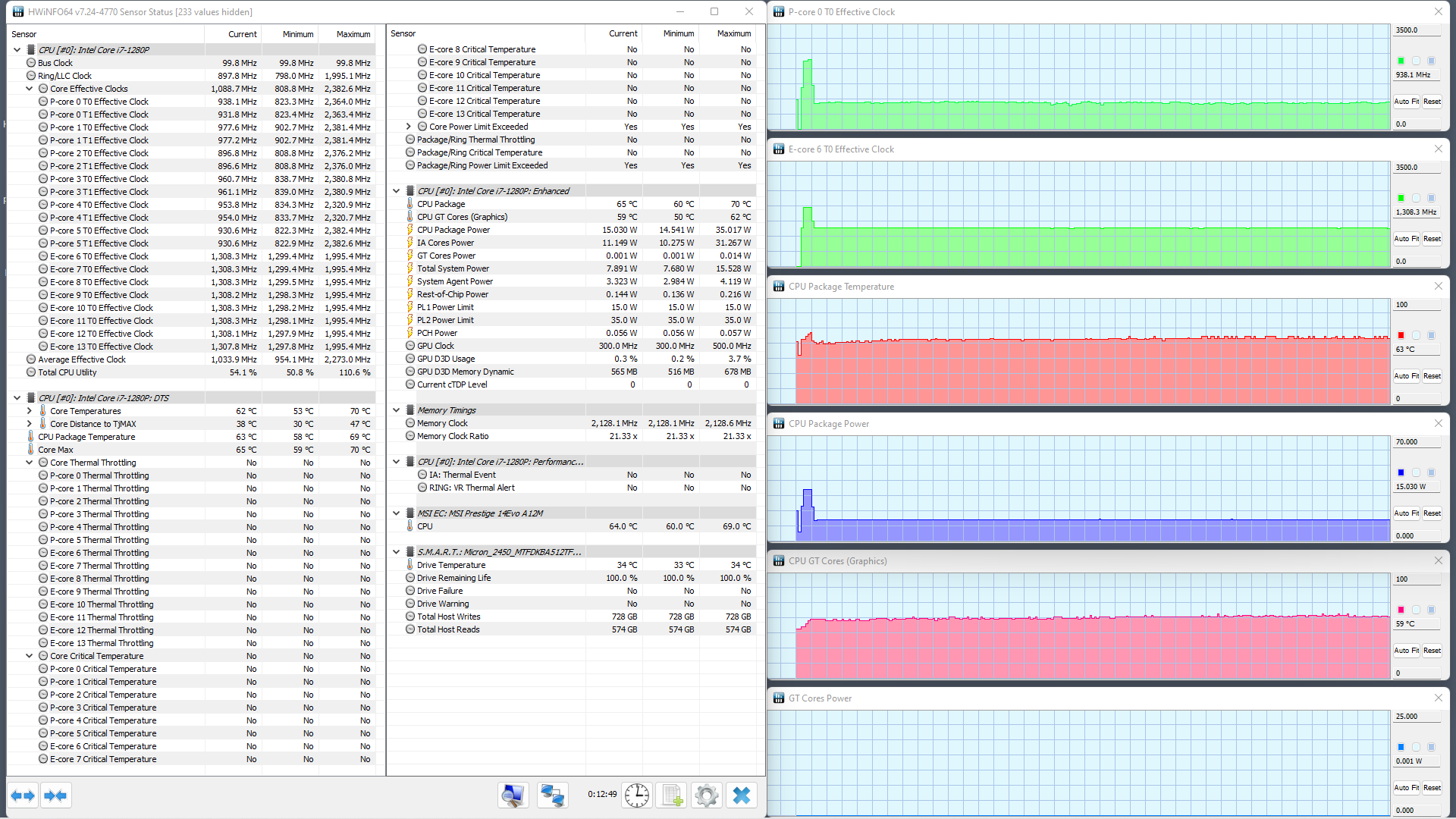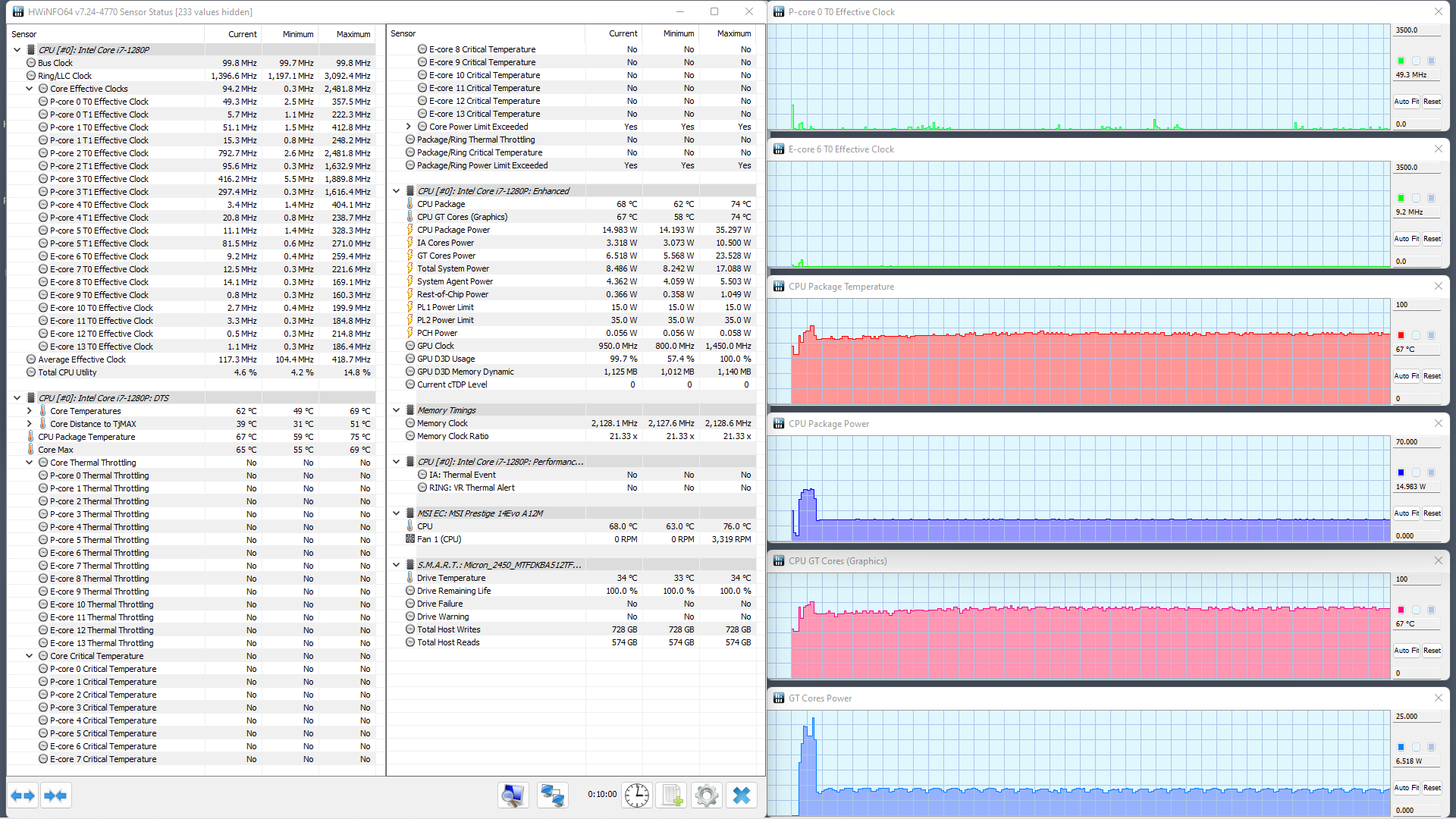 Напомним, что в MSI Prestige 14 Evo A12M-248RU установлен мобильный процессор Intel Core i7-1280P со штатным тепловыделением 28 Вт и 64 Вт в турборежиме. Этот чип объединяет в себе 14 ядер: