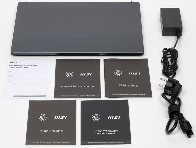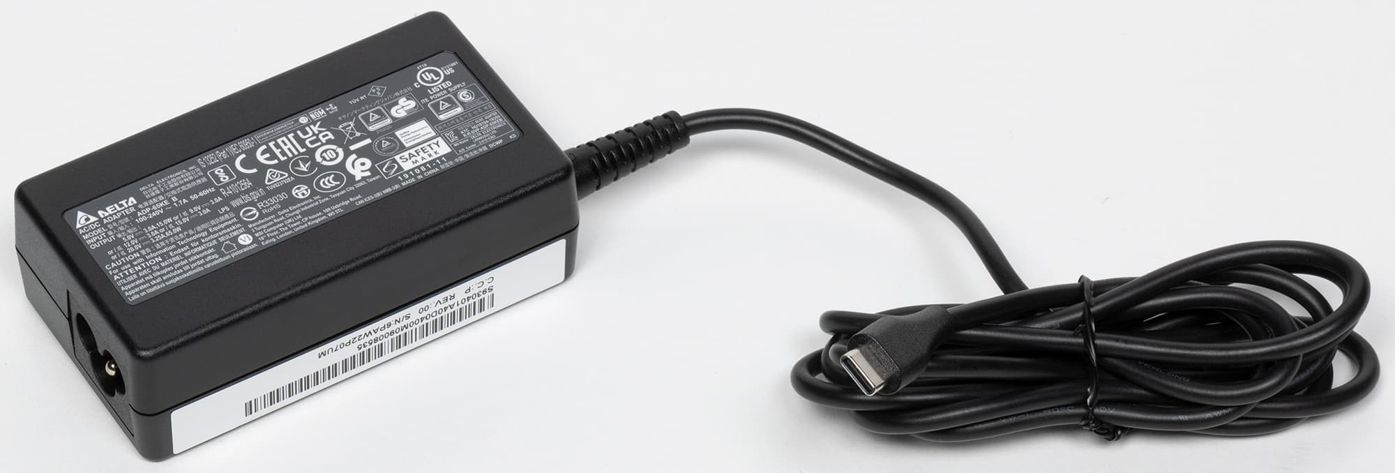 Помимо самого ноутбука в комплекте поставки обнаруживается довольно легкий (181 г, с кабелем питания — 272 г) адаптер питания, который подходит для работы от сети переменного тока 50—60 Гц при напряжении 100—240 В и обеспечивает на выходе 65 Вт при силе тока 3 А. Прилагается также несколько полезных бумажек.