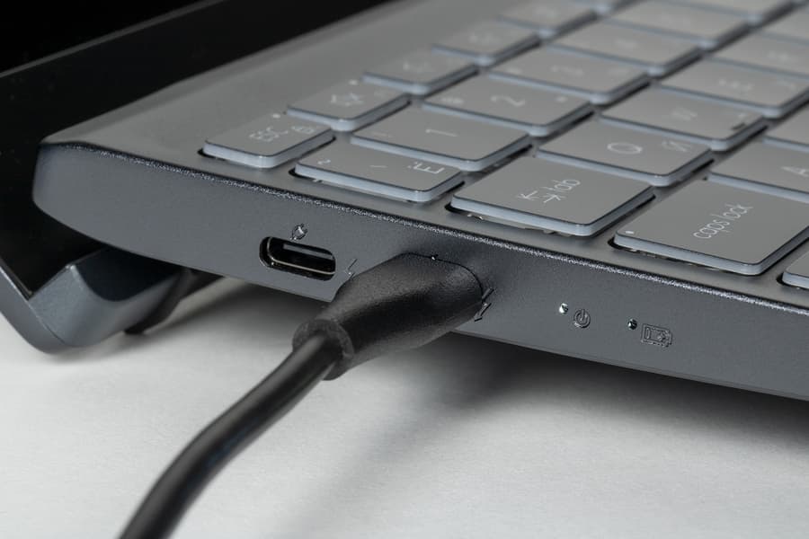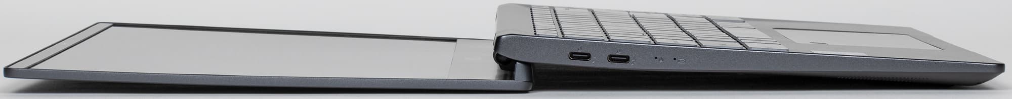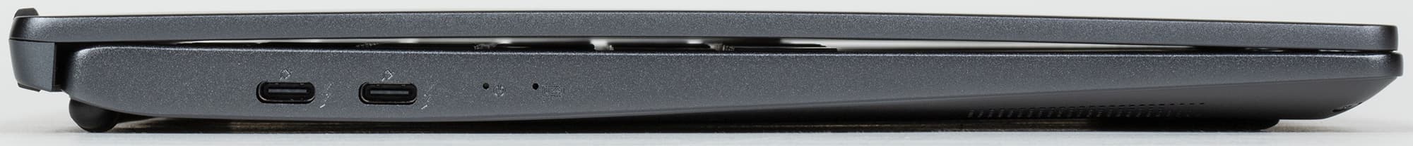 Слева заметны два разъема USB 3.2 Type-C. Оба поддерживают функциональность Thunderbolt 4 и могут служить для зарядки внешних устройств (Power Delivery), а второй от экрана — способен выводить видео и в режиме DisplayPort. Далее располагаются два одинаковых по цвету светодиодных индикатора. Первый из них загорается при работе от электрической сети, а второй — в процессе зарядки батареи.
