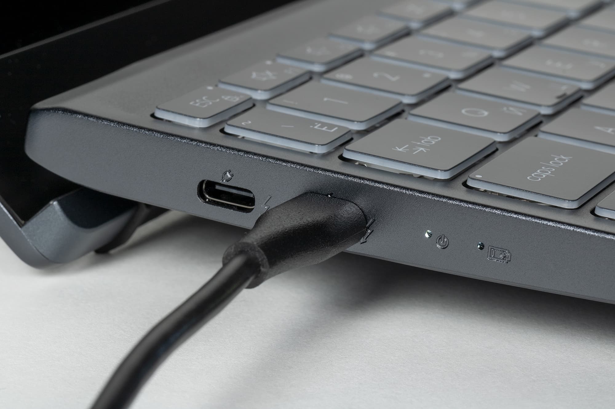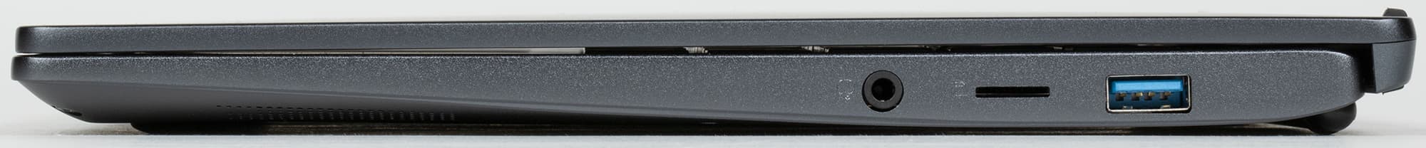 На левой боковой панели разместились комбинированный миниджек (3,5 мм) для подключения аудиогарнитуры, картовод для microSD и коннектор USB 3.2 Gen 1 Type-A.