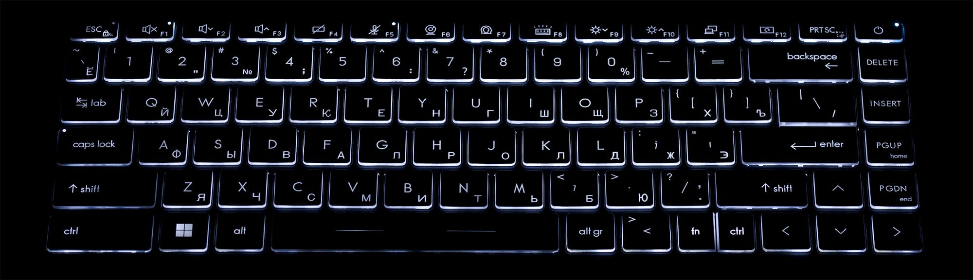Клавиатура снабжена трехуровневой по яркости подсветкой (четвертое состояние — выключена), переключение между разными уровнями производится повторным нажатием аккорда Fn+F7. Все символы и торцы кнопок подсвечиваются одинаково.