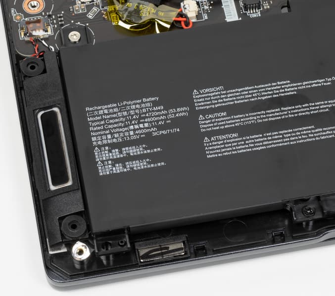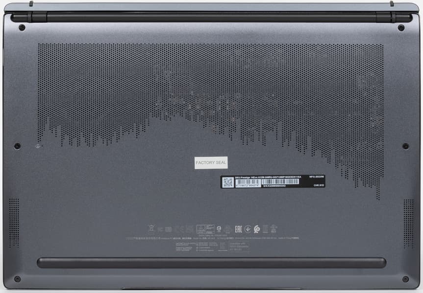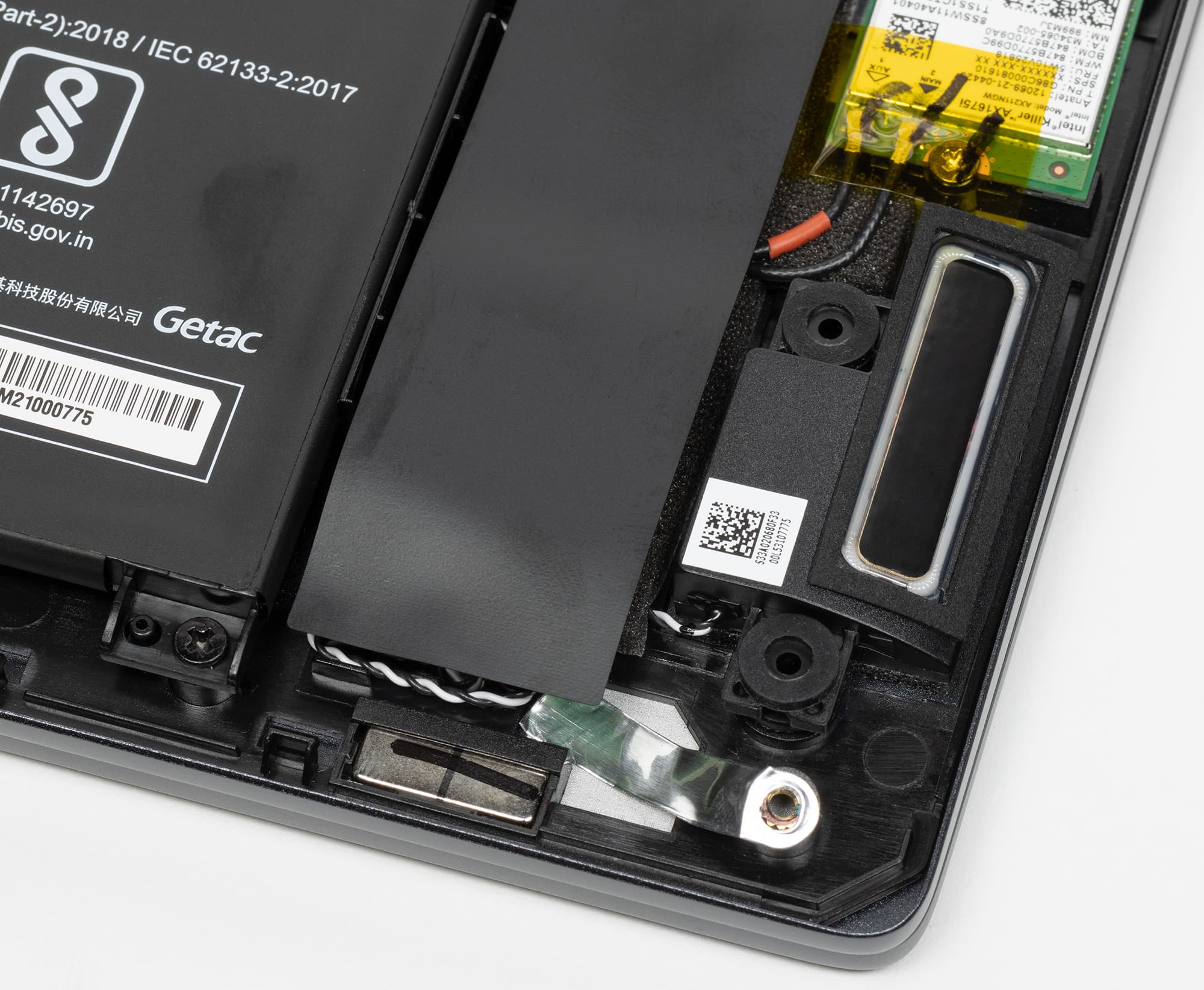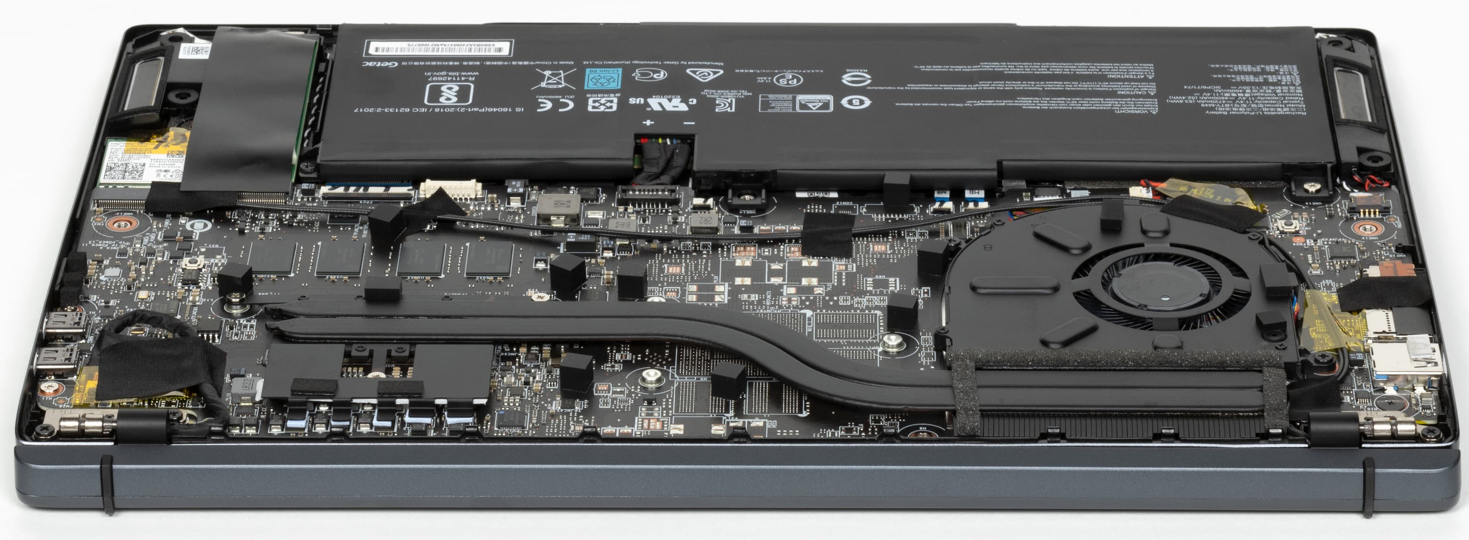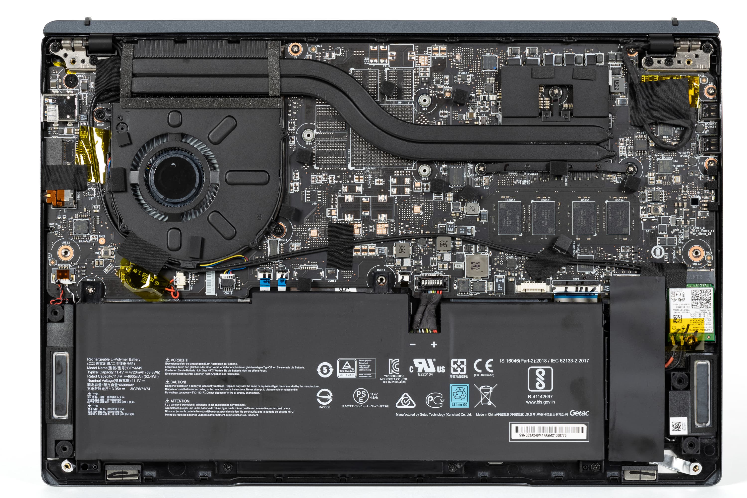 Вопреки традициям внутреннего устройства тонких портативных ПК, внутри у MSI Prestige 14 Evo A12M-248RU не столь тесно, как можно было предполагать. Наиболее заметные элементы конструкции — вытянутая в ширину корпуса батарея между двумя громкоговорителями, вентилятор, радиатор и тепловые трубки системы охлаждения.