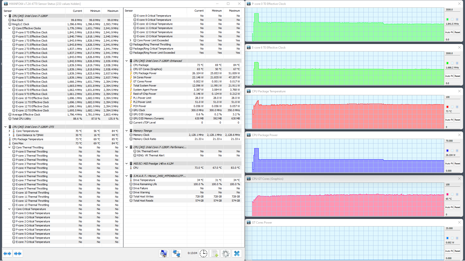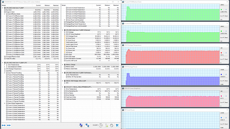 - В высокопроизводительном профиле (High Performance) процессор в турборежиме отбирает до 66 Вт, а в стабильном — до 38 Вт, что превышает его паспортные максимумы. При этом тактовая частота ядер остается заметно ниже максимальной. Интегрированная графика в пике работает на максимально разрешенной тактовой частоте. Ни перегрева, ни тротлинга не фиксируется.