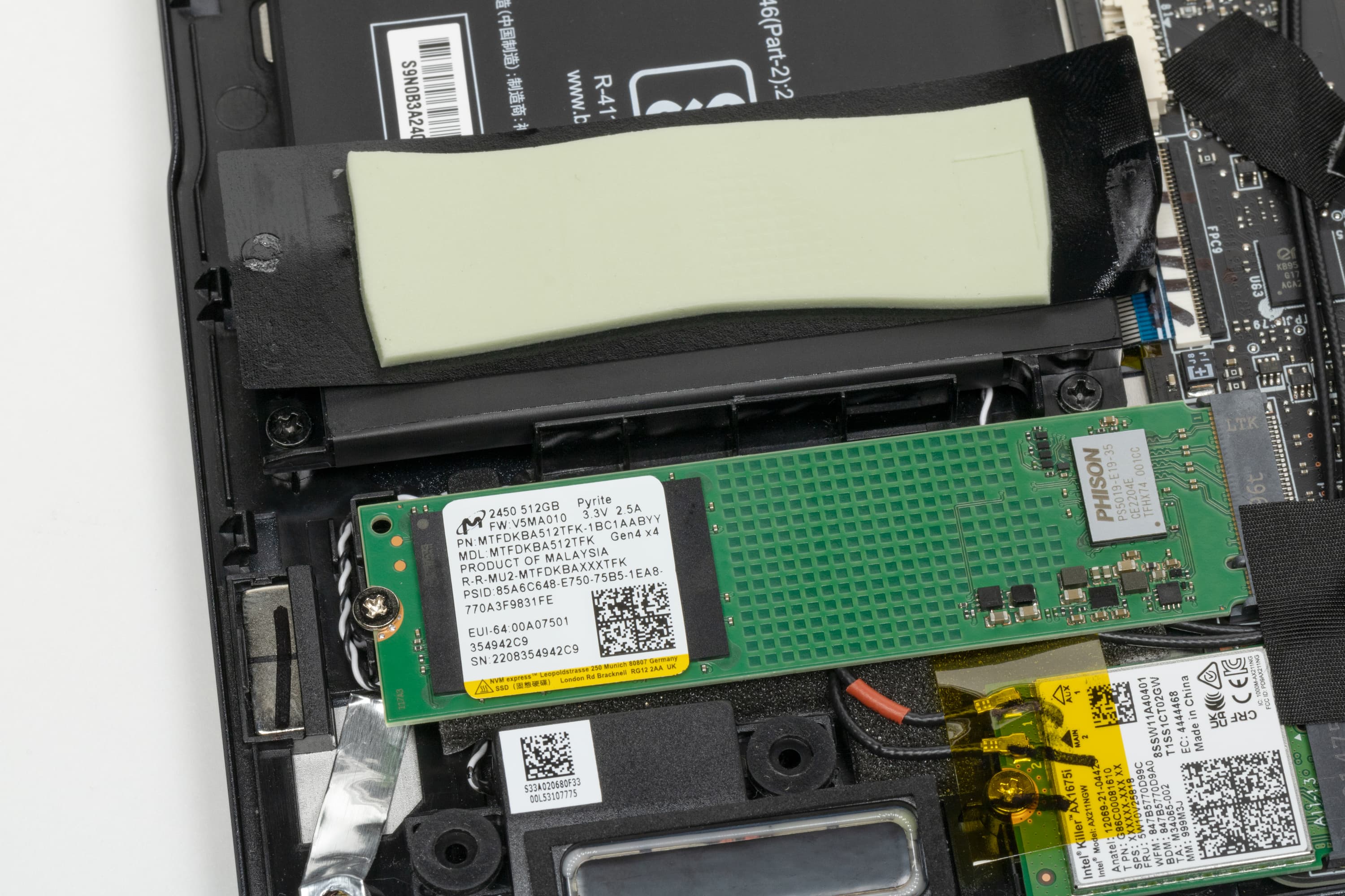 MSI Prestige 14 Evo A12M-248RU оснащен твердотельным накопителем Micron 2450 емкостью 512 ГБ, установленным в единственном доступном слоте M.2 (интерфейс PCIe Gen 4). На официальном сайте micron.com из полезной информации о нем можно найти лишь неполные спецификации да скорость последовательного чтения (3600 МБ/с).