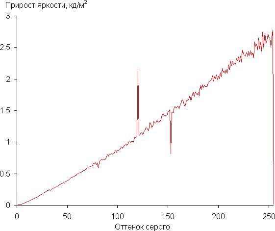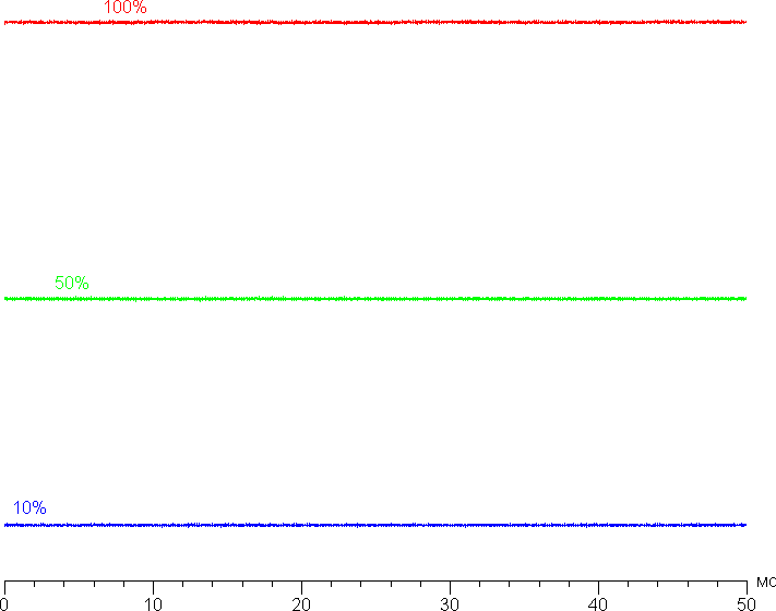 На любом уровне яркости значимая модуляция подсветки отсутствует, поэтому нет и никакого мерцания экрана (нет ШИМ). В доказательство приведем графики зависимости яркости (вертикальная ось) от времени (горизонтальная ось) при различных значениях настройки яркости: