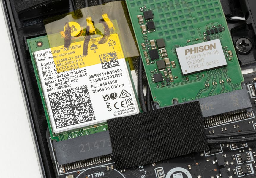 Рядом с SSD-накопителем установлен PCIe-адаптер беспроводной связи Intel AX1675i Wi-Fi 6e (802.11ax) форм-фактора M.2. Он же обеспечивает связь по Bluetooth 5.2.