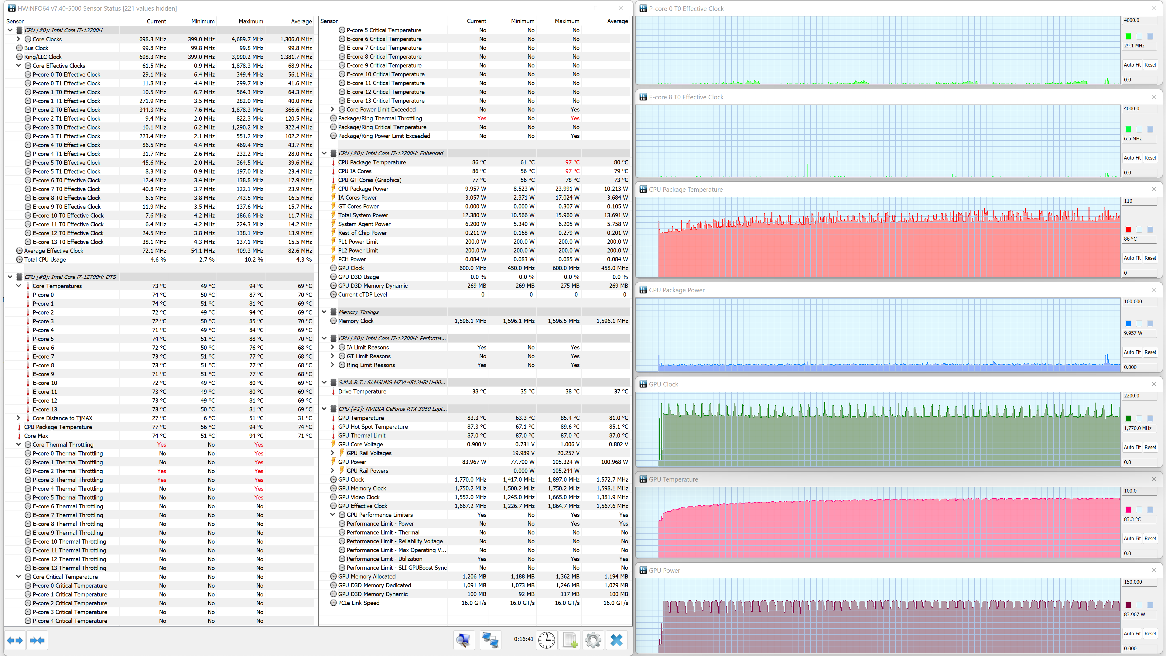 Интегрированная графика Intel Iris Xe не представляет интереса в играх, но в MSI Pulse GL66 установлена дискретная видеокарта Nvidia GeForce RTX 3060 Laptop с 6 ГБ GDDR6. Это, так сказать, наиболее сбалансированное решение по соотношению производительности и цены, безусловно поддерживающее к тому же трассировку лучей. Отбор мощности GPU составил в наших экспериментах в пике 105 Вт при тактовой частоте 2,1 ГГц. Низкоуровневые параметры экипировки видеокарты можно получить в отчетах приложения GPU-Z.