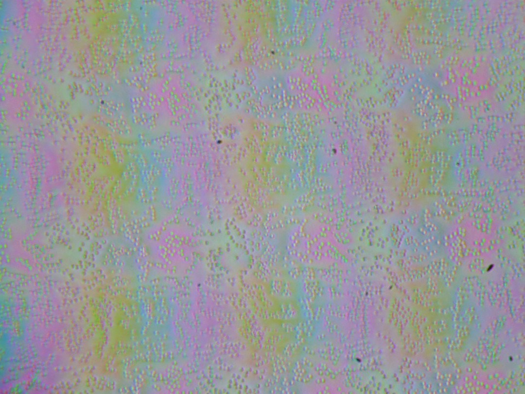 Зерно этих дефектов в несколько раз меньше размеров субпикселей (масштаб этих двух фотографий примерно одинаковый), поэтому фокусировка на микродефектах и «перескок» фокуса по субпикселям при изменении угла зрения выражены слабо, из-за этого нет и «кристаллического» эффекта, но едва заметное изменение яркости и оттенка на уровне субпикселей все же есть.