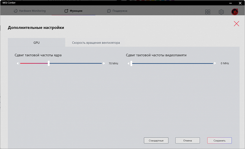 Более подробные настройки есть только для профиля «Смарт-авто» и сценария экстремальной производительности, в котором можно разогнать графический процессор и видеопамять до +200 МГц, а также выбрать профиль работы вентиляторов: автоматический, Cooler Boost или настраиваемый.
