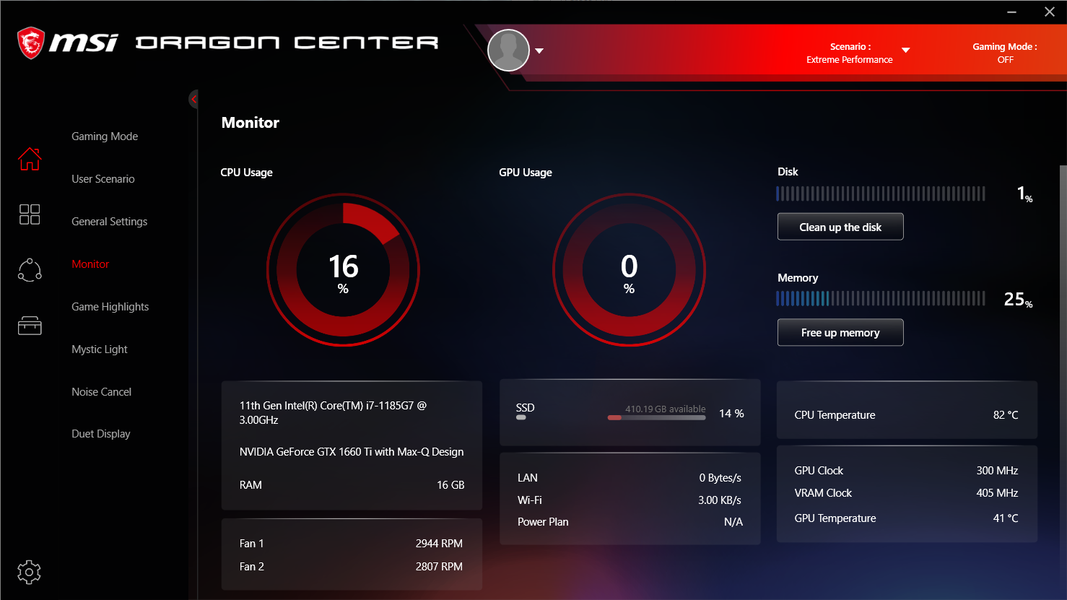В случае большой нагрузки на процессор и/или видеокарту шум от системы охлаждения высокий, его можно немного снизить (разумеется, за счет снижения производительности), выбрав профиль Super Battery, Balanced или Silent. Неприятно, что в любом случае в шуме от системы охлаждения присутствует призвук в виде стрекота (на невысокой мощности) или свиста (на высокой мощности), это весьма раздражает. При работе от него никуда не деться, но хотя бы в простое мы вправе были рассчитывать на тишину. К сожалению, тишина достигается только при выборе профиля Super Battery, в нем ноутбук какое-то время может работать в пассивном режиме, хотя через несколько минут бесшумной работы вентилятор на непродолжительное время все же включается. Более того, в профиле Super Battery слишком уж урезана производительность, поэтому перед запуском сколько-нибудь ресурсоемкого приложения придется переключать профиль вручную, а потом переключаться обратно. Это вряд ли можно назвать полноценным выходом из ситуации. И поскольку штатные режимы работы системы охлаждения, задаваемые в фирменной утилите Dragon Center, с проблемой справиться не могут, нам пришлось переключаться в пользовательский режим и настраивать кривую работы вентиляторов от нагрева самостоятельно (мы просто увели график в ноль при самом низком нагреве). Однако мы бы не ожидали, что этим готов заниматься каждый покупатель ноутбука, так что, скорее всего, после массового поступления MSI Stealth 15M в продажу интернет начнет полниться жалобами на акустический дискомфорт. К сожалению, раздражающий призвук всегда сопровождает работу вентилятора при частоте вращения от 2500 об/мин, а это, по-видимому, его минимальная частота вращения (мы пробовали выставить 1%, но получили те же 2500 об/мин).