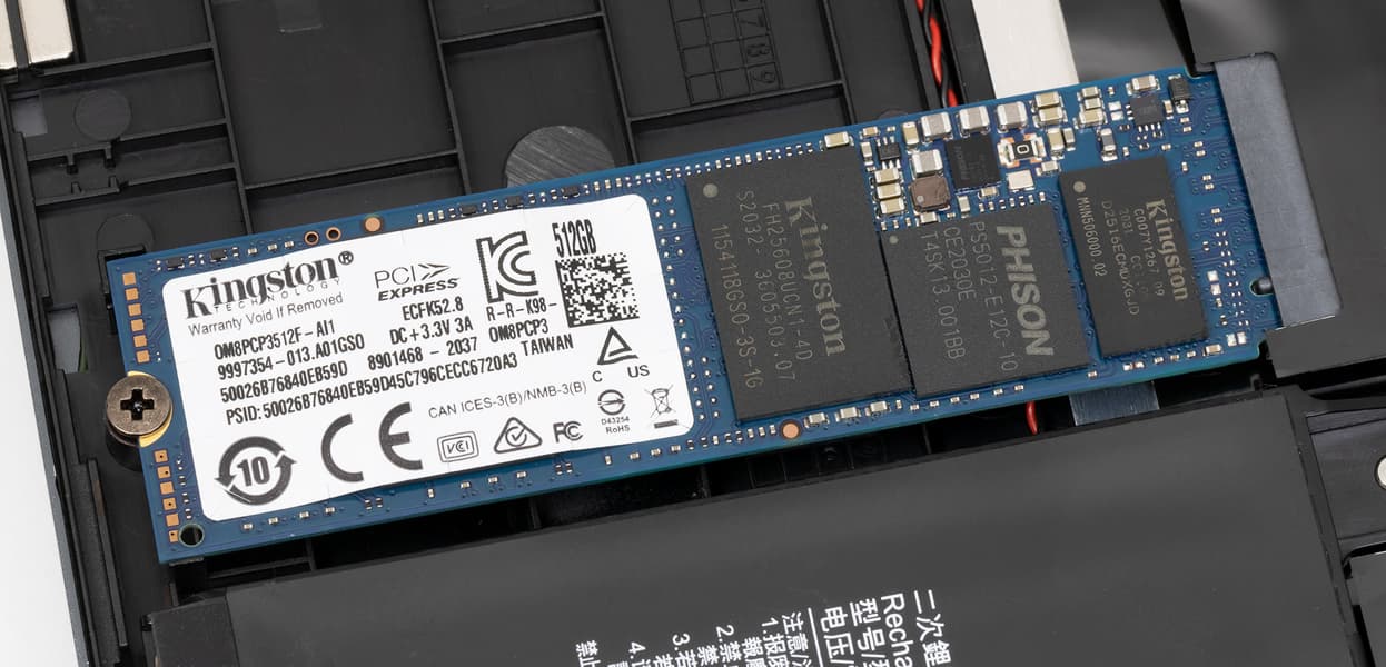 В нашей модификации ноутбука был установлен SSD-накопитель Kingston OM8PCP3512F-AI1 на 512 ГБ. Это NVMe-диск, установленный в слот M.2 и подключенный к внутреннему порту PCIe x4. Линейные скорости чтения и записи у него достаточно высокие.
