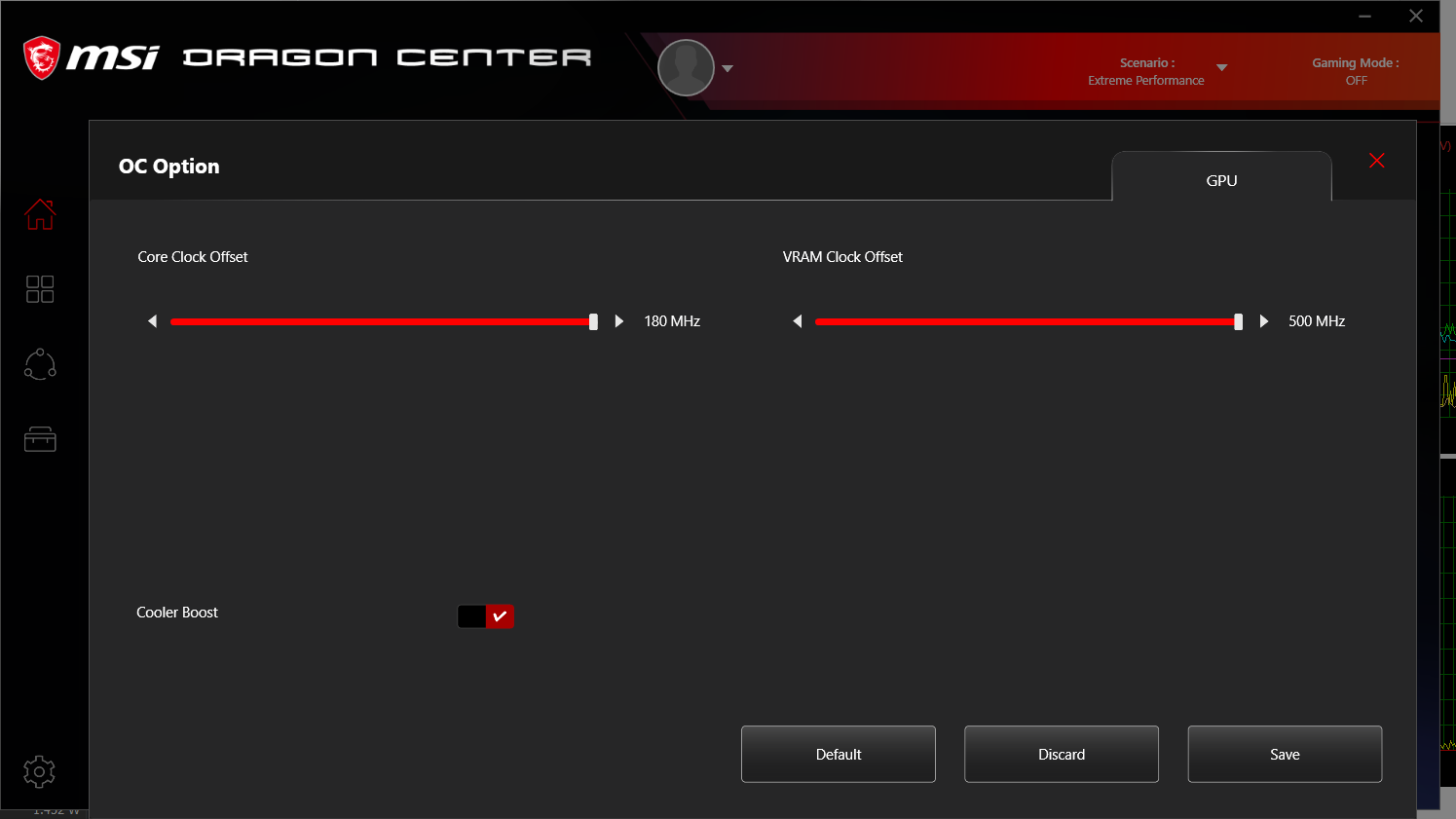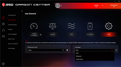 Главная фирменная утилита в данном случае называется Dragon Center, и главная ее функция — выбор сценария (как это здесь названо) работы комплектующих и системы охлаждения. Всего утилита предлагает 4 готовых сценария с очевидными названиями и, за одним исключением, без возможности настройки, а также пользовательский сценарий, в котором можно выбрать желаемый уровень производительности и профиль работы кулеров. В частности, только в пользовательском сценарии и в сценарии максимальной производительности можно выбрать максимальный режим работы кулеров — Cooler Boost. Впрочем, шум от него настолько высокий, что вряд ли кто-то захочет выбрать его в качестве долговременного. Также только в пользовательском сценарии можно выбрать и настроить продвинутый режим работы кулеров: задать кривую скорости вращения вентилятора (отдельно для кулеров CPU и GPU) по шести точкам с условной степенью нагрева. При выборе уровня производительности Turbo для пользовательского сценария можно дополнительно разогнать видеокарту (до +180 МГц частоты ядра и до +500 МГц частоты памяти), для сценария Extreme Performance это стандартная настройка. Подробнее о штатных сценариях мы поговорим в разделе тестирования под нагрузкой. Быстро переключать сценарии можно без запуска утилиты, перебор осуществляется по нажатию Fn+F7, с наглядной индикацией, это удобно.