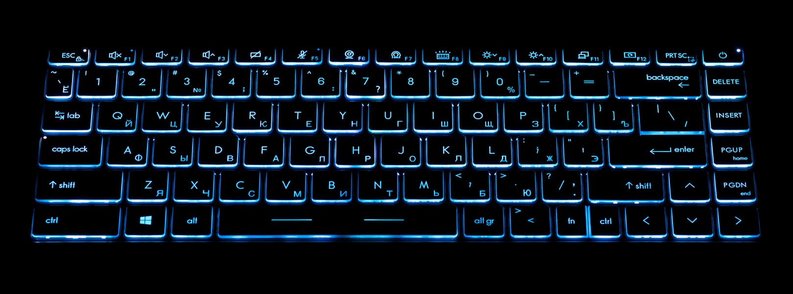 Кнопки клавиатуры здесь имеют полноценную RGB-подсветку, реализовано несколько режимов свечения (статичный цвет, дыхание, дыхание со сменой цветов, переход цветов) и отключение подсветки. В фирменной утилите Dragon Center можно детально настраивать эффекты, в том числе меняя цвета и яркость свечения, а затем сочетанием клавиш можно быстро перебирать эти режимы. Неудобно то, что при таком богатстве возможностей не нашлось места простому изменению яркости статичной подсветки (хотя бы два режима, для разных типичных условий) — для выполнения этого простого действия придется как минимум запускать утилиту и лезть в настройки.